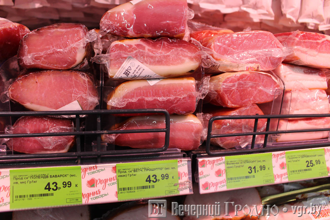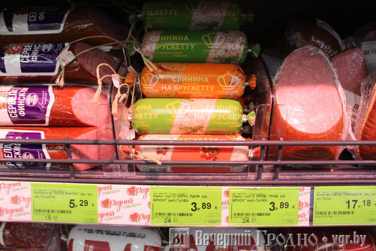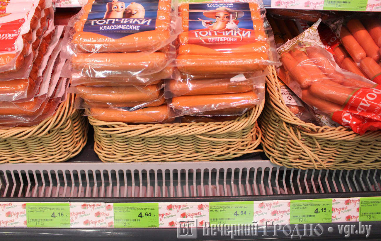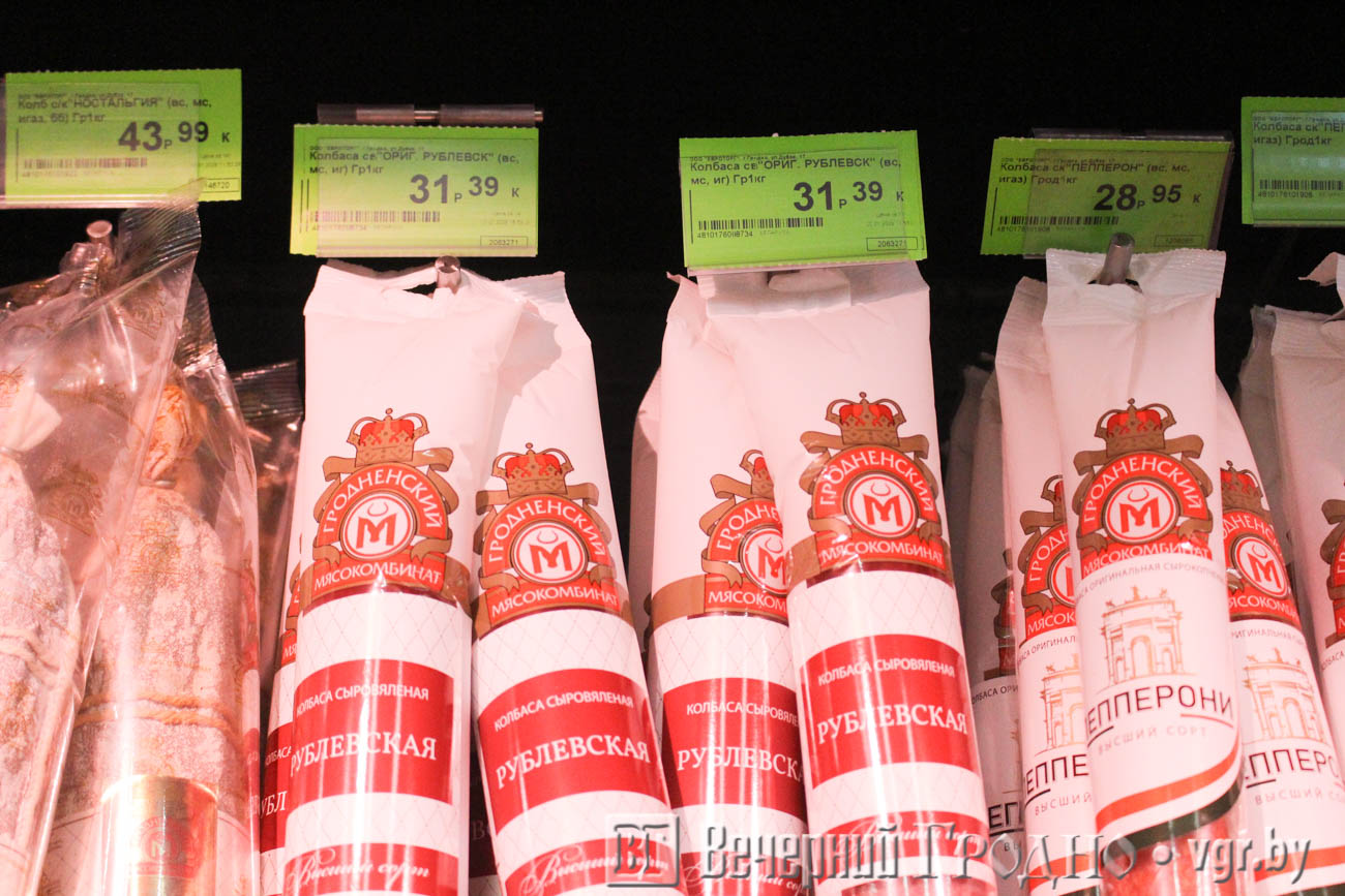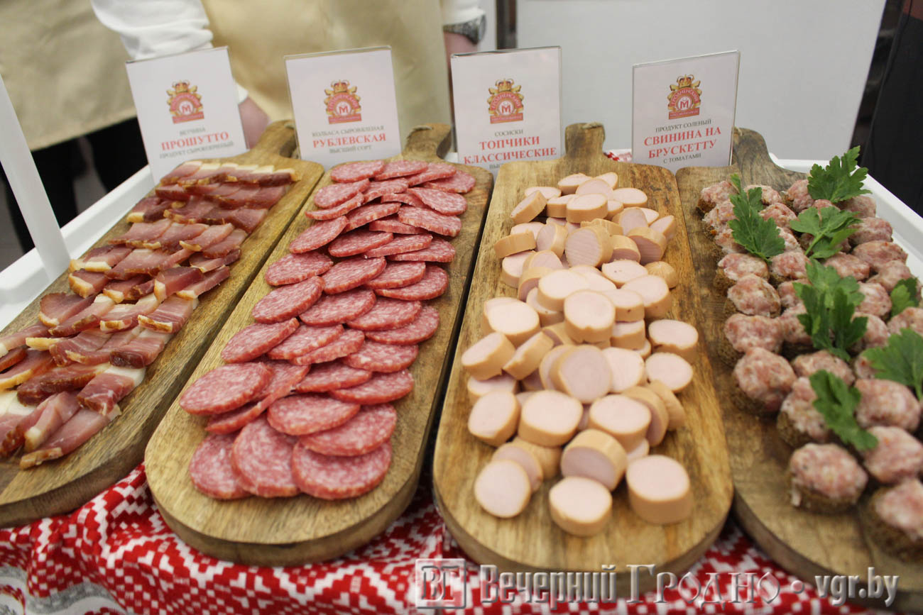 Гродненский мясокомбинат представил колбасные изделия и мясные продукты, в том числе ветчину прошутто, сосиски «Топчики Классические», солёную свинину на брускетту с томатами и сыровяленую колбасу «Рублевская».