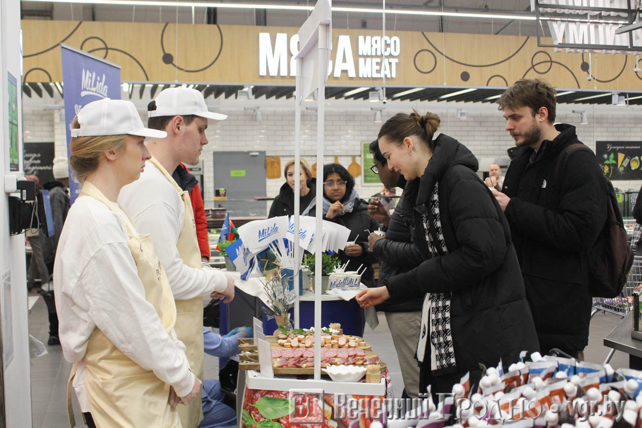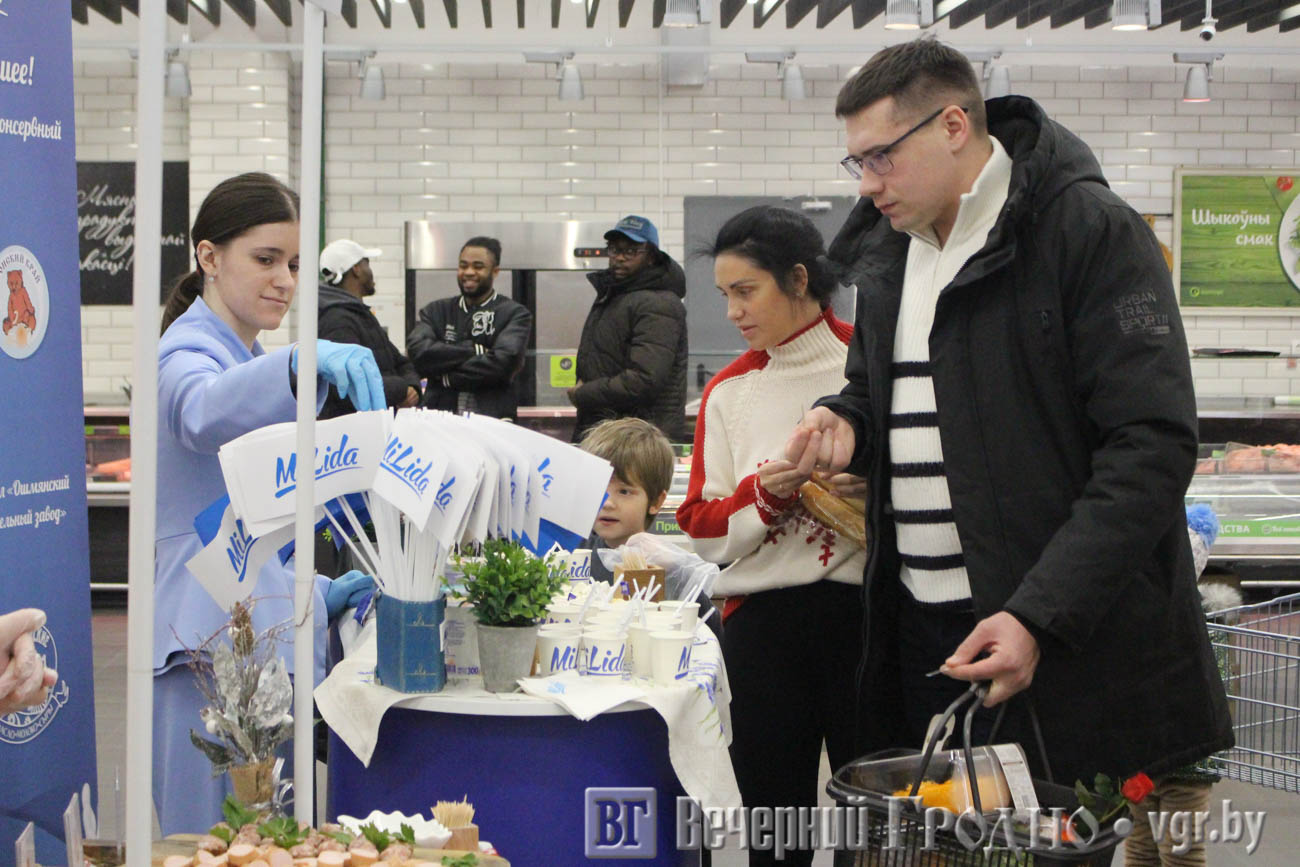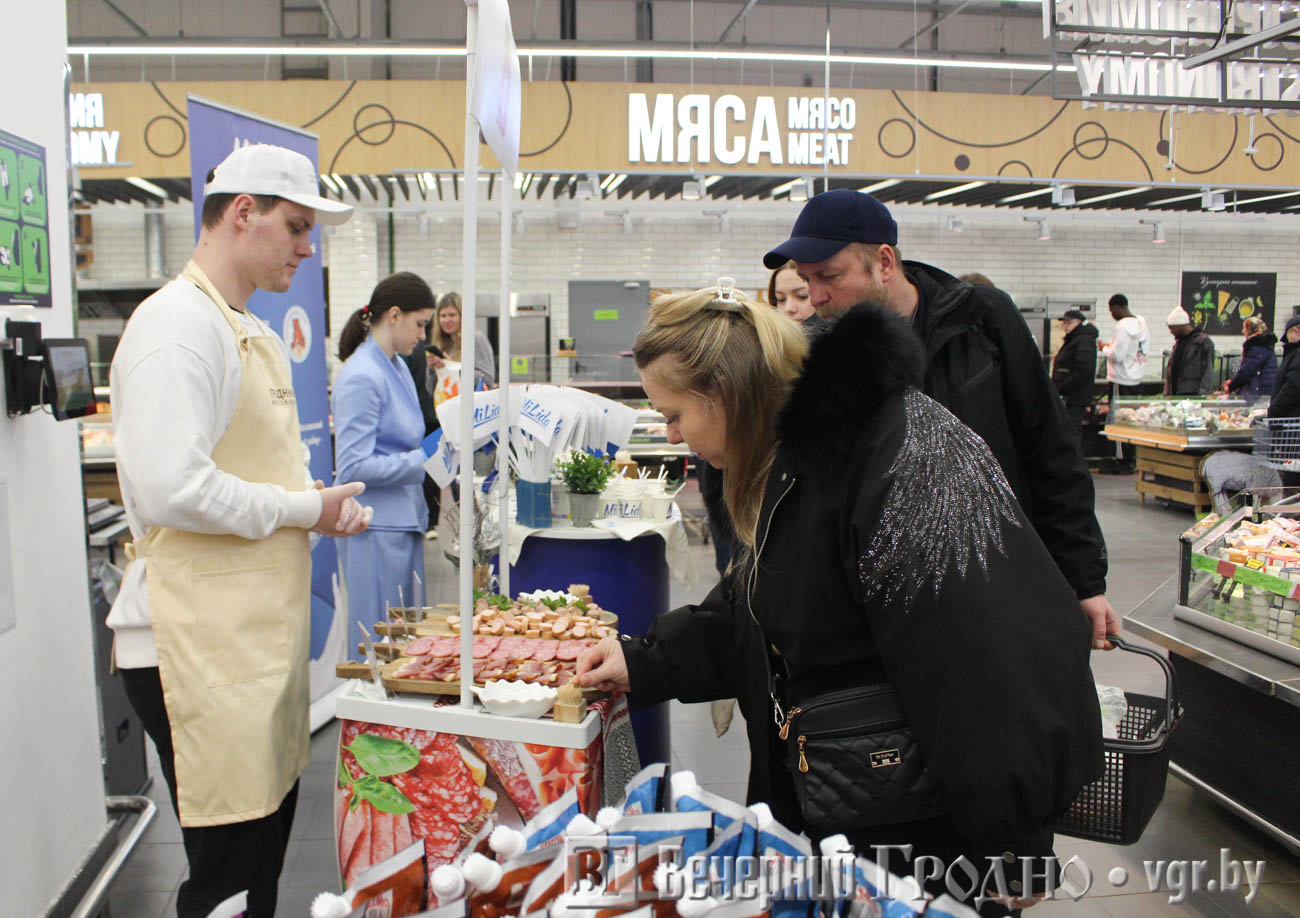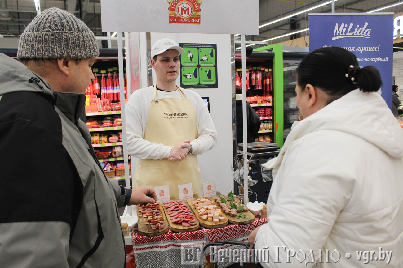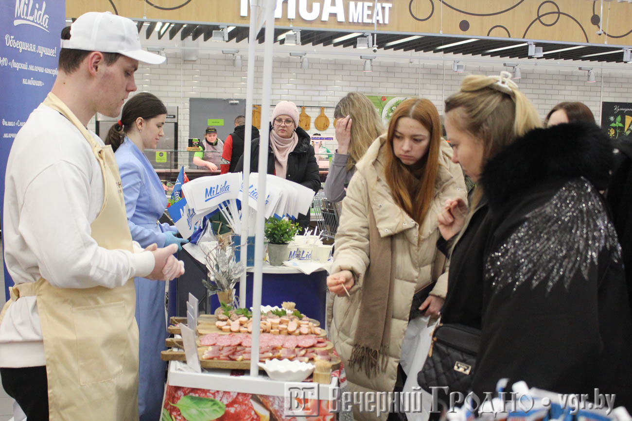 Традиционно в Гродно местом проведения стал ТЦ OldCity. К концу рабочего дня в «Евроопте» было многолюдно. Люди активно закупались на выходные, но не упустили возможность продегустировать продукцию белорусских заводов.