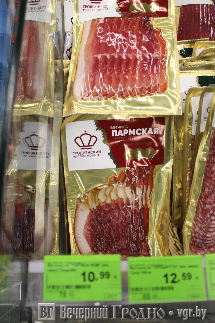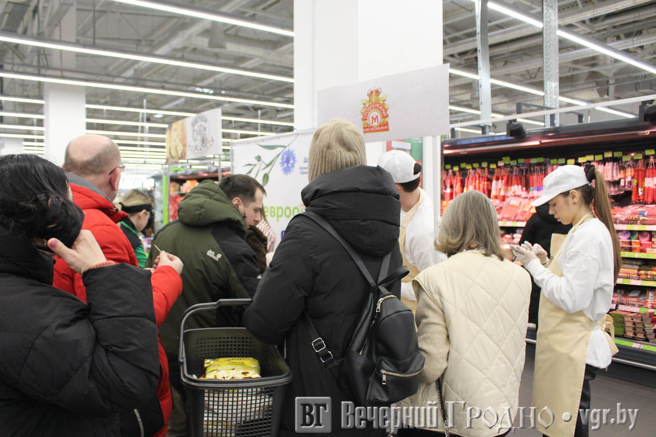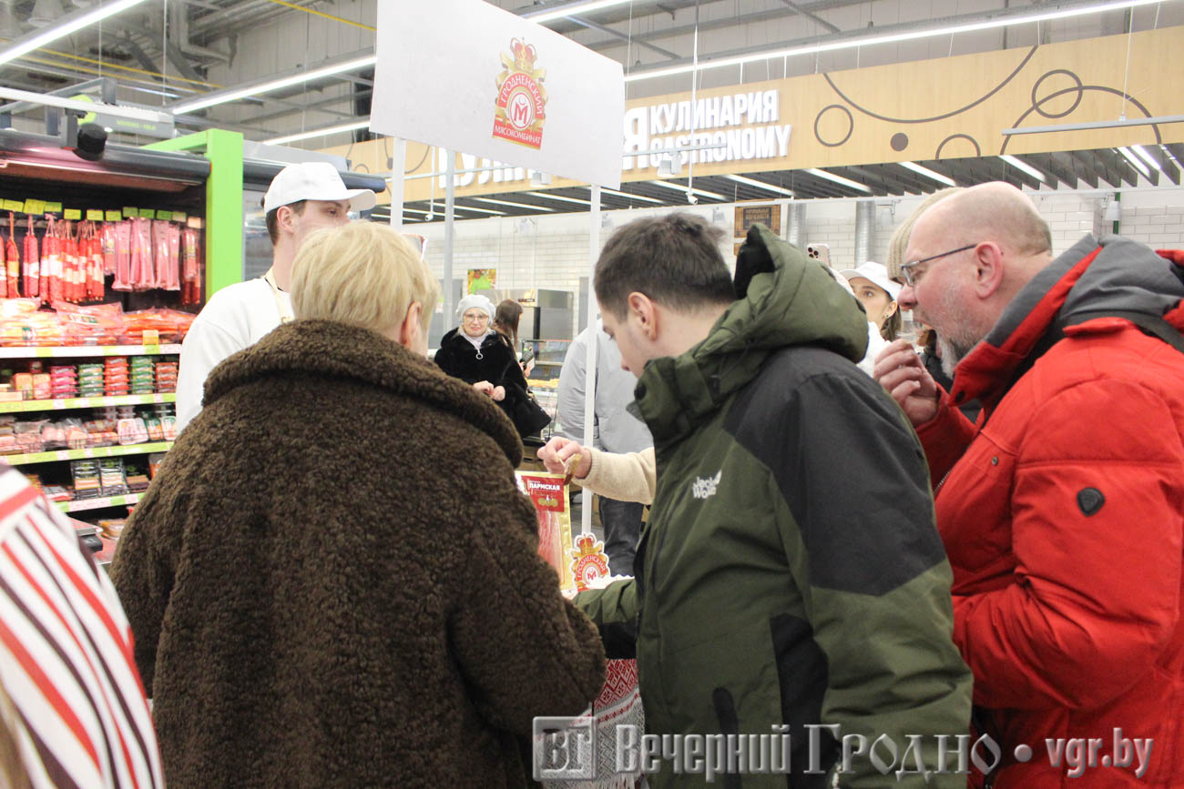 Гродненский мясокомбинат угощал покупателей гипермаркета ветчиной «Пармская», сосисками «Топчики рубленные», солёной свининой на брускетту с прованскими травами и сырокопченой колбасой «Ностальгия».