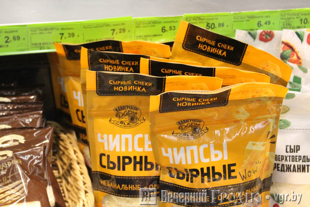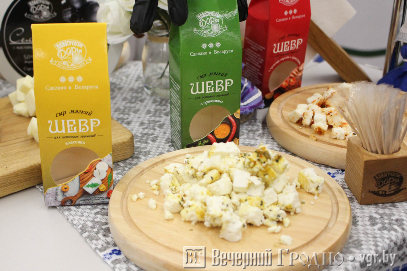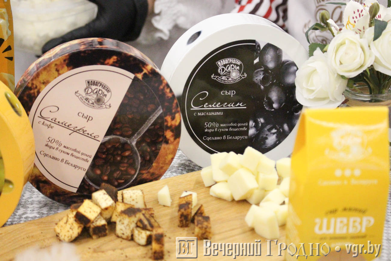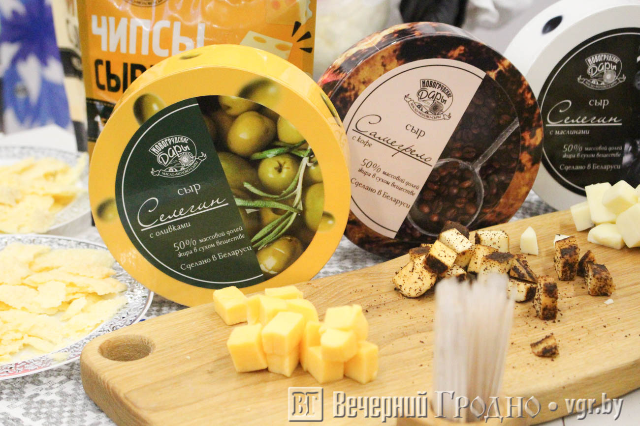Предприятие представило новинку — сырные чипсы классические и со вкусом белых грибов. Они сушатся из сыра маасдама. Кроме того можно было попробовать сыры типа сулугуни: селегин с оливками и маслинами, а также самегрело с кофе. Кофейный вкус очень приглянутся гродненцам — люди говорили, что это очень необычное сочетание. Не удивительно, что с прилавков сыр с кофе расхватали очень быстро. Прилавок находился рядом со столом дегустации.