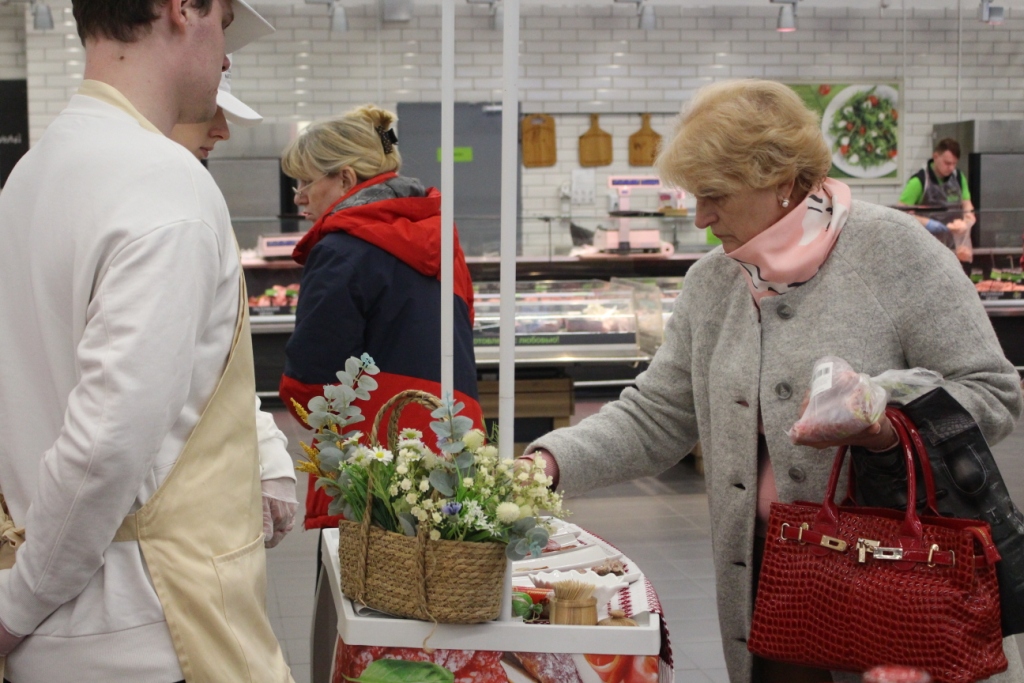 Свою продукцию представил ОАО «Гродненский мясокомбинат». Промоутеры угощали покупателей гипермаркета солёной свининой на брускетту с прованскими травами, сырокопченым продуктом «Прошутто», сырокопченой колбасой высшего сорта: «Пьемонте» и сосисками «Топчики Классические».