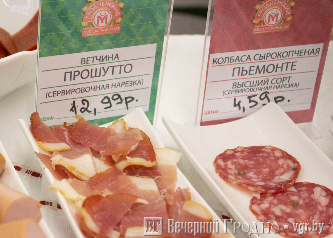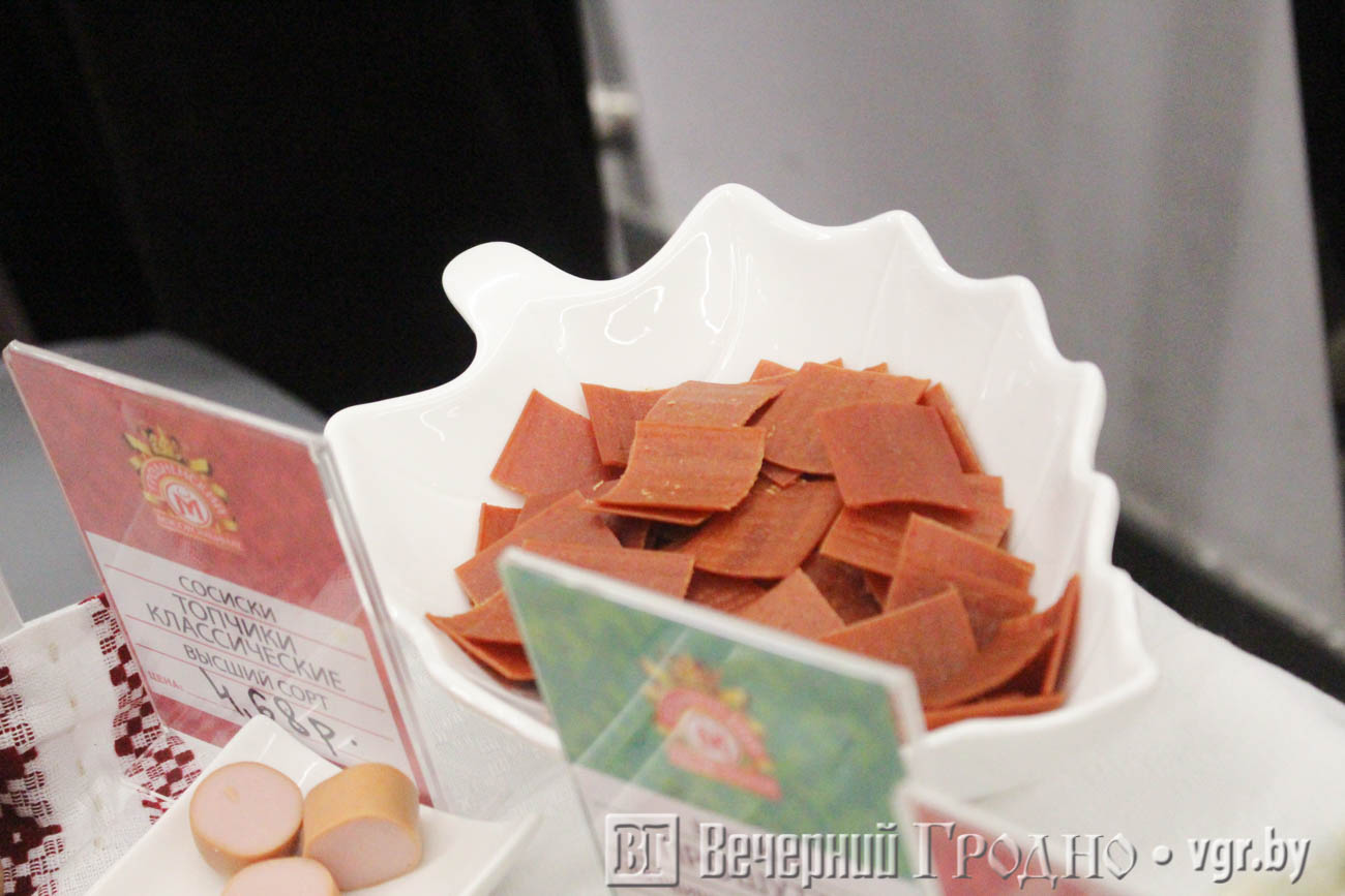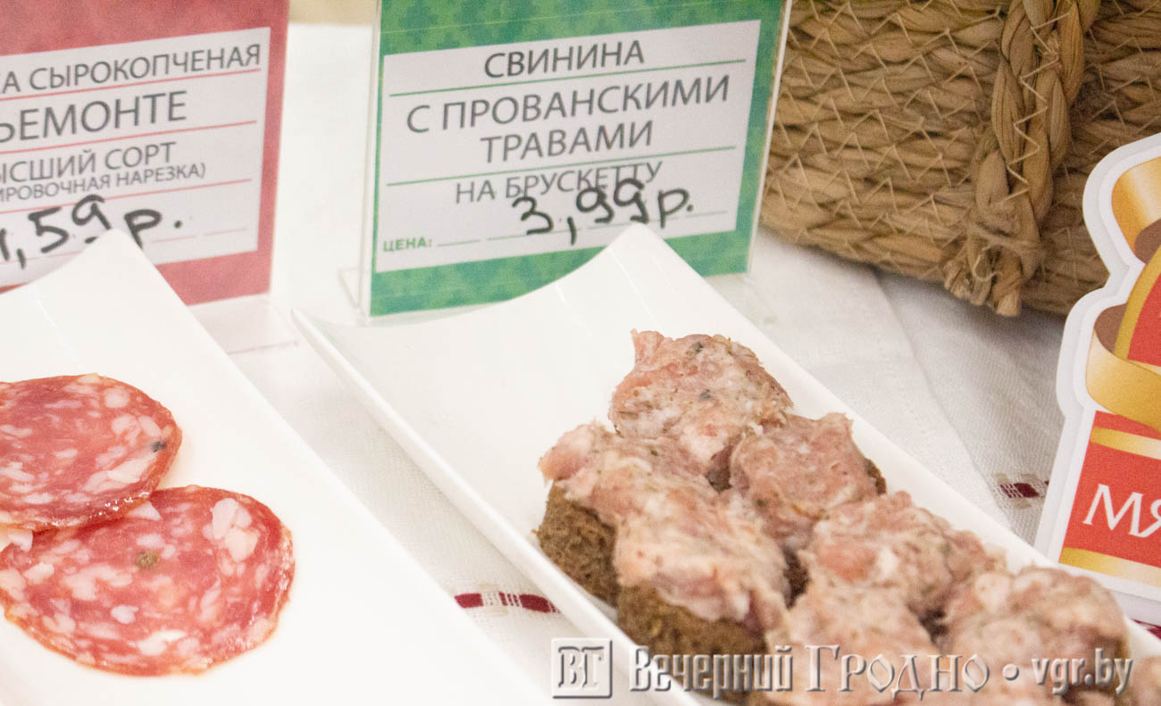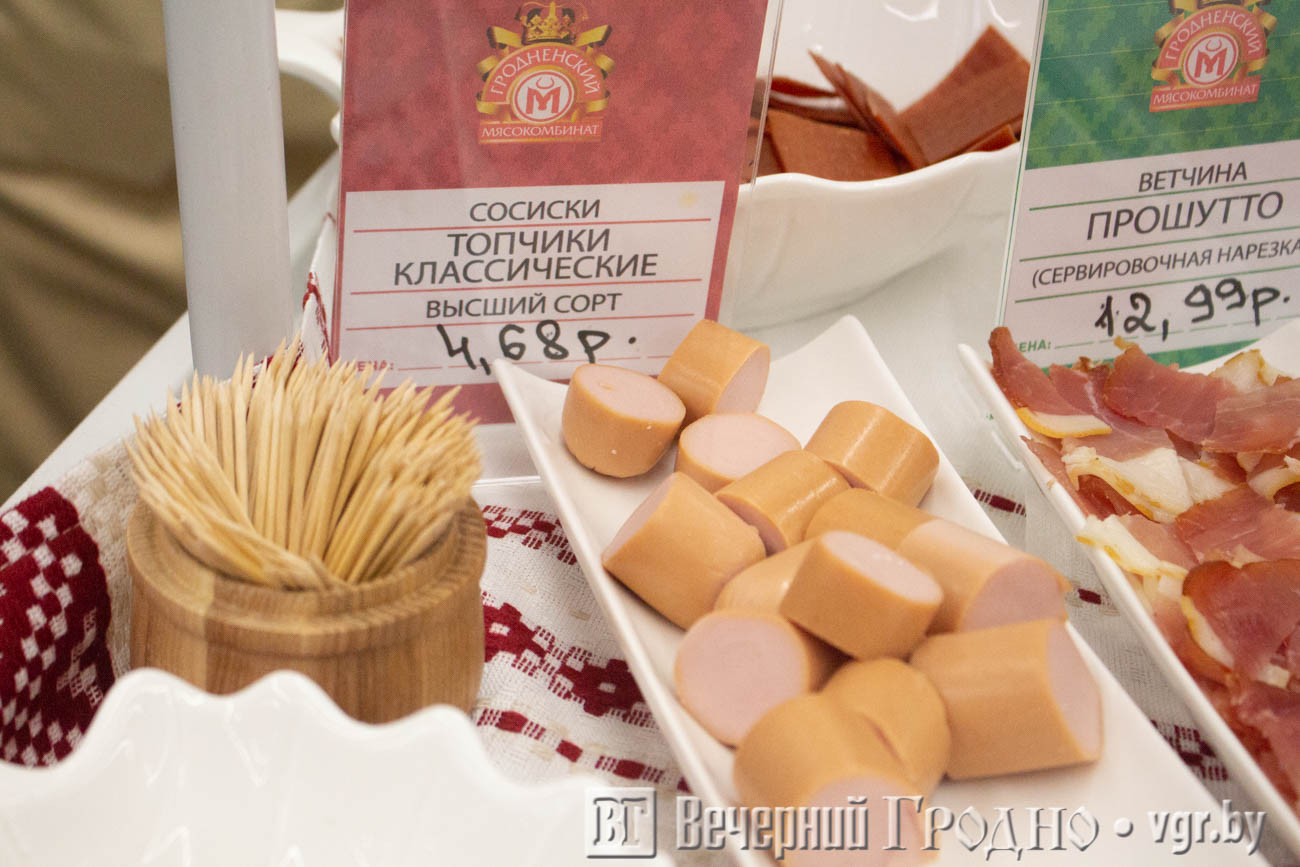 Свою продукцию представил ОАО «Гродненский мясокомбинат». Промоутеры угощали покупателей гипермаркета солёной свининой на брускетту с прованскими травами, ветчиной «Прошутто», сосисками «Топчики Классические» и сырокопченой колбасой «Пьемонте». Кроме того промоутеры угощали гродненцев чипсами — полосками из птицы, но в продаже их не было.
