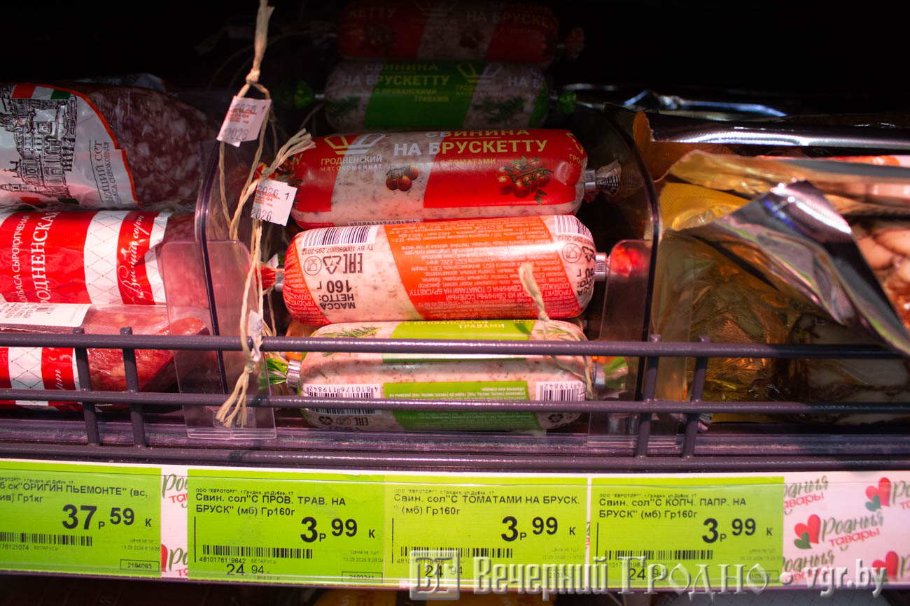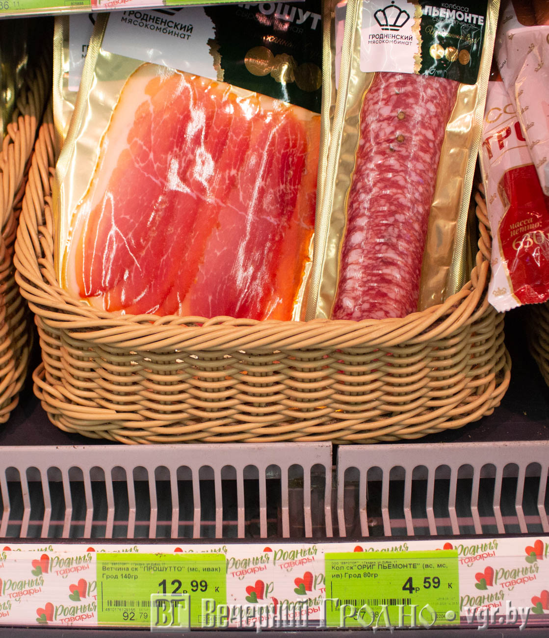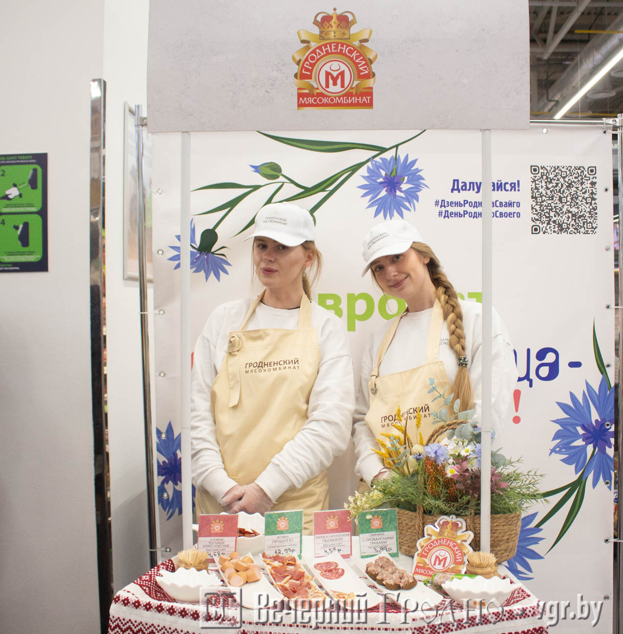 Свою продукцию представил ОАО «Гродненский мясокомбинат». Промоутеры угощали покупателей гипермаркета солёной свининой на брускетту с прованскими травами, ветчиной «Прошутто», сосисками «Топчики Классические» и сырокопченой колбасой «Пьемонте». Кроме того промоутеры угощали гродненцев чипсами — полосками из птицы, но в продаже их не было.