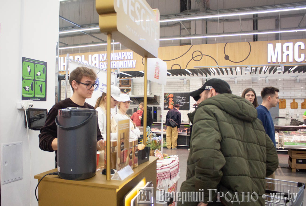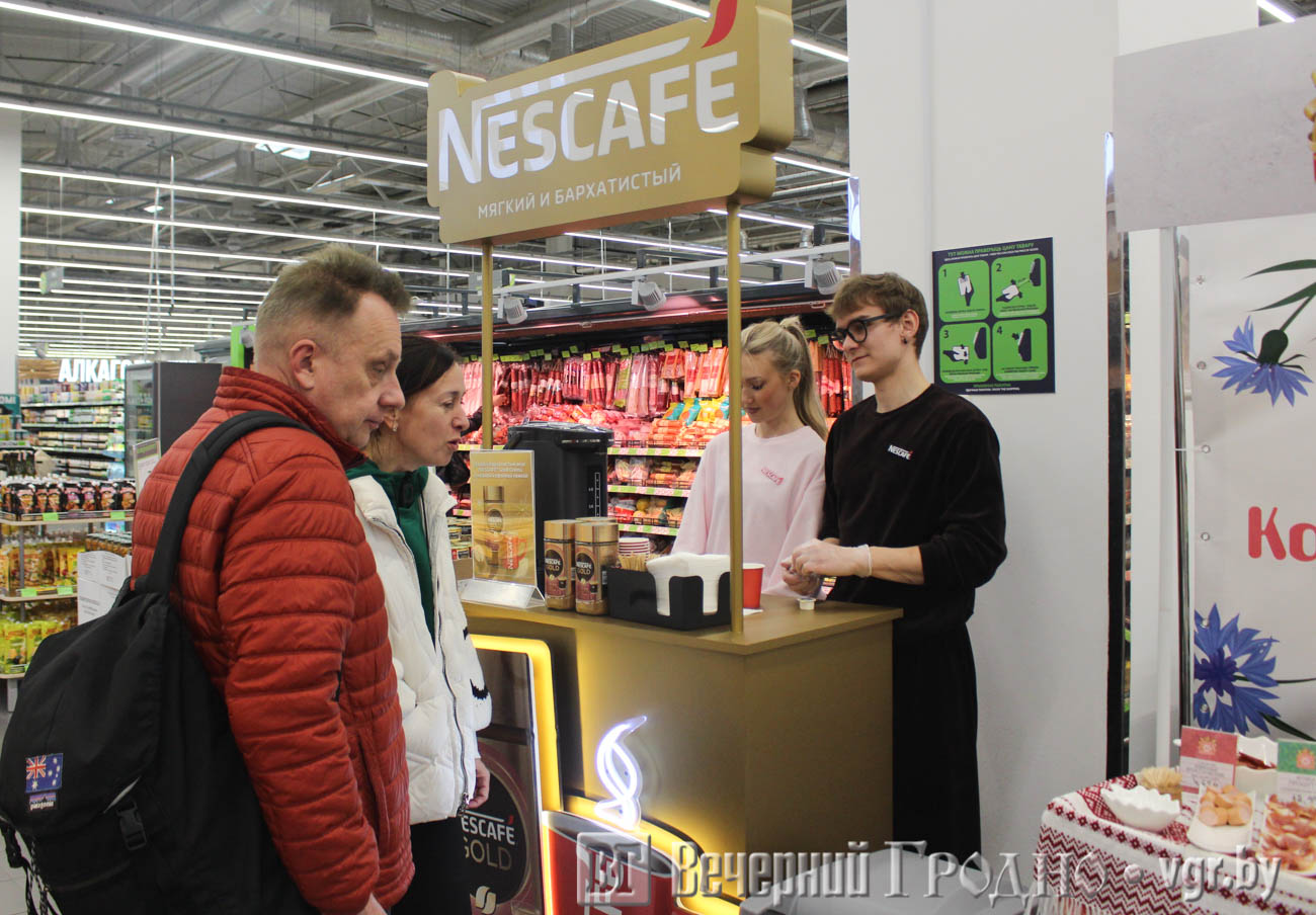 В этот день в «Евроопт» проводилась еще одна дегустация. Рядом с представителями ОАО «Гродненский мясокомбинат» разместились промоутеры компании «Нескафе». Молодые парень и девушка угощали гродненцев натуральным растворимым кофе «Нескафе Голд Крема».
