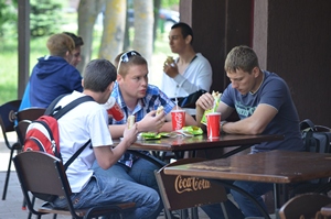 Если в летних кафе в центре города отдыхают как дети, так и взрослые, то в спальных микрорайонах за столиком любят посидеть местные мужчины. Возле универсама «Брест» после работы полно посетителей. Два пенсионера, Алексей и Михаил, признались, что живут недалеко. На столе — яблоки, нарезанная колбаса и… газированный напиток. Рассказали, что только вернулись из бани, а за едой зашли в продуктовый отдел универсама.