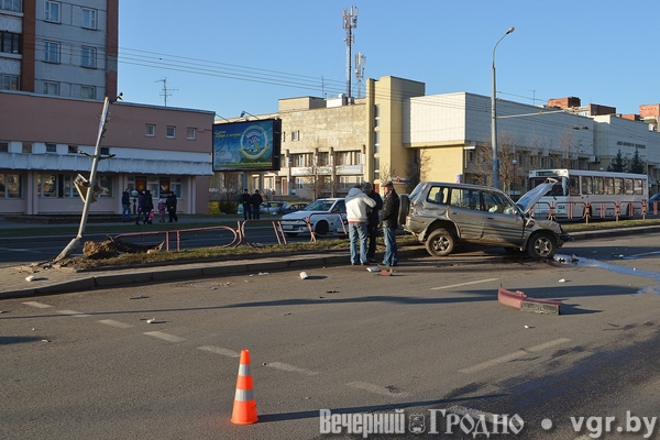 Как сообщили очевидцы происшествия, девушка на крайслере выкатилась со двора и не уступила дорогу «Тойоте». Водитель «Тойоты», чтобы избежать столкновения, взял левее и вылетел на островок безопасности, где снёс светофор и пару метров металлического ограждения.