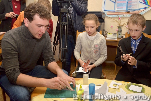 Прэзентацыя папяровых мадэляў замкаў Ігара Адасіка для малодшых школьнікаў прайшла ў цэнтральнай бібліятэцы. Падчас сустрэчы дзеці зрабілі Лідскі замак усім класам.