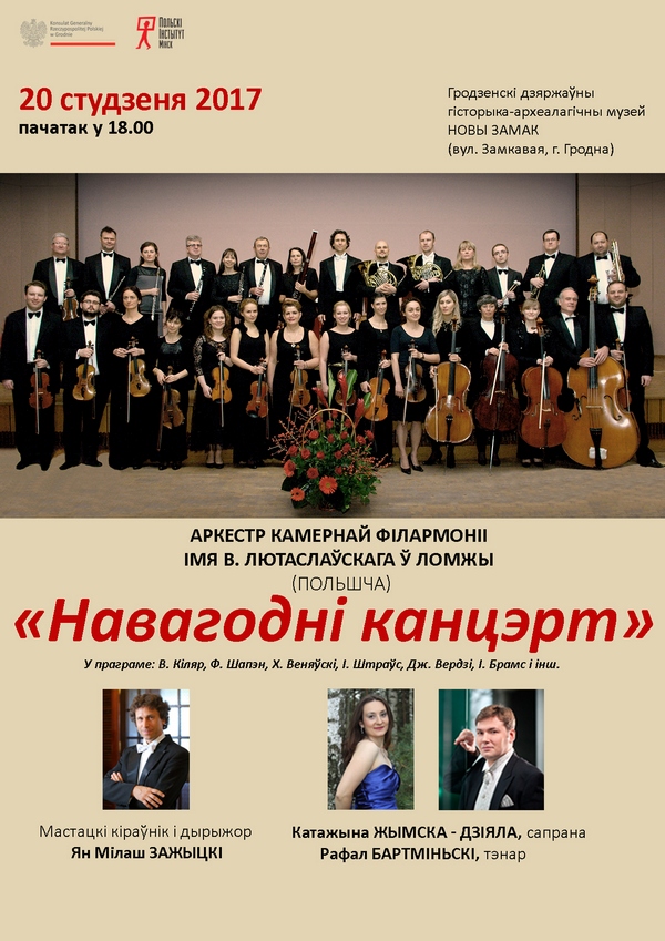 Ценителей классической музыки и живого исполнения арий ждет концерт оркестра Ломжинской камерной филармонии имени В. Лютославского. Свой талант гродненцам представят польские оперные певцы: сопрано — Катажина Жымска-Дияла, тенор — Рафал Бартминьски.