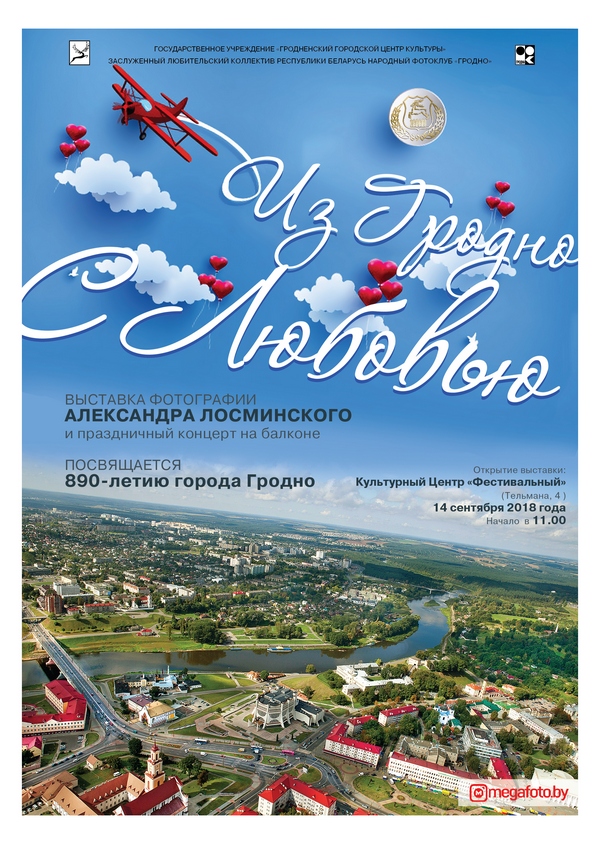Увидеть город с другой стороны жителям и гостям города предлагает фотограф Александр Лосминский. Его персональная выставка «Из Гродно с любовью» откроется в Культурном центре «Фестивальный» на улице Тельмана, 4. Открытие выставки и праздничный концерт на балконе состоится 14 сентября в 11:00.