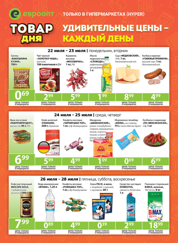Сотни товаров со скидками и специальные предложения — с 15 по 27 июля, покупатели в магазинах «Евроопт» смогут выгодно купить продукты питания, продукцию собственного производства, свежее мясо, бытовую химию, косметику и товары для дома.