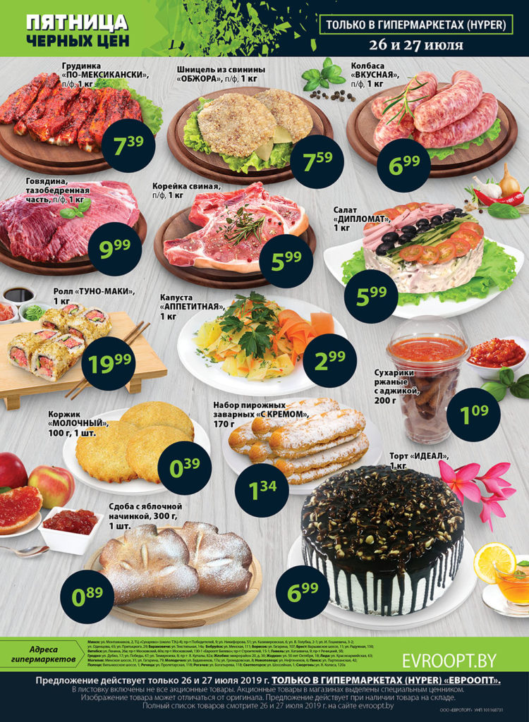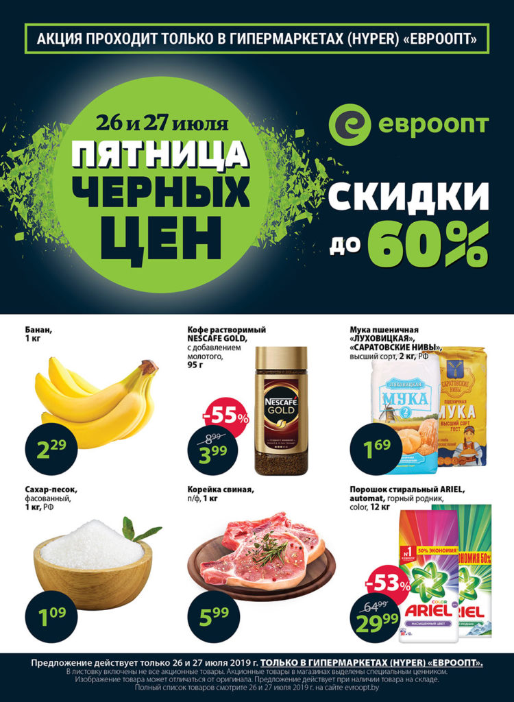 Традиционная акция «Пятница чёрных цен» пройдёт в гипермаркетах «Евроопт» 26 и 27 июля.
