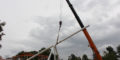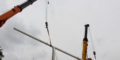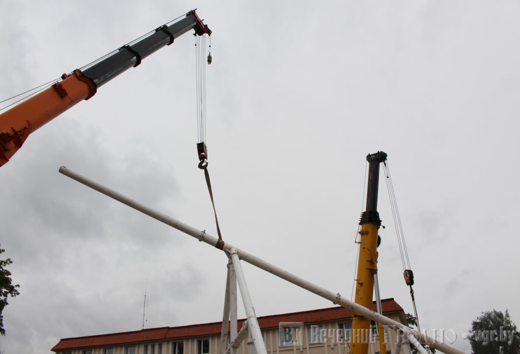 Так, опоры крепили с помощью крана грузоподъёмностью 200 тонн. Такую технику предоставило ОАО «Гродно Азот». На двух грузовых платформах для работы крана привели специальные грузы-противовесы.