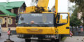 На месте будущего аттракциона работает крупногабаритная техника, а стрелы кранов привлекают внимание прохожих, которые наблюдают за процессом.