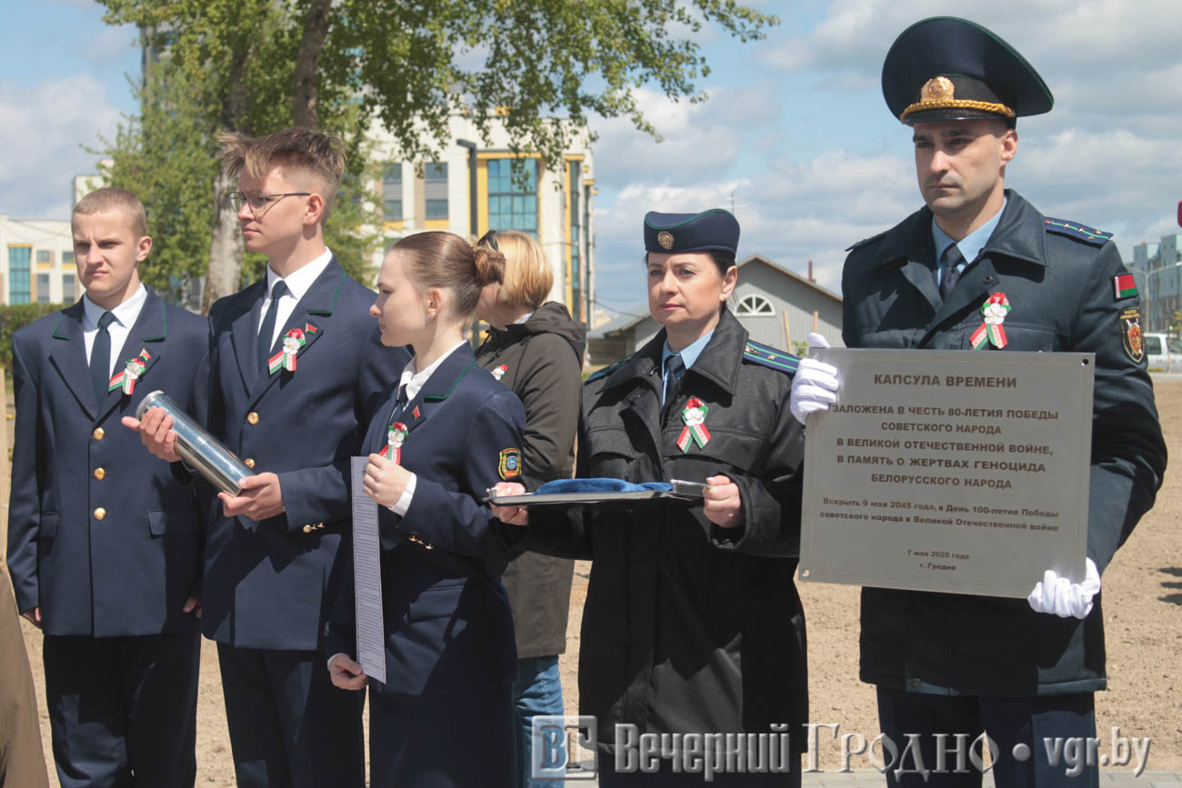 Гости заложили капсулу времени как символ памяти о жертвах геноцида белорусского народа в честь 80-летия Победы советского народа в Великой Отечественной войне.
