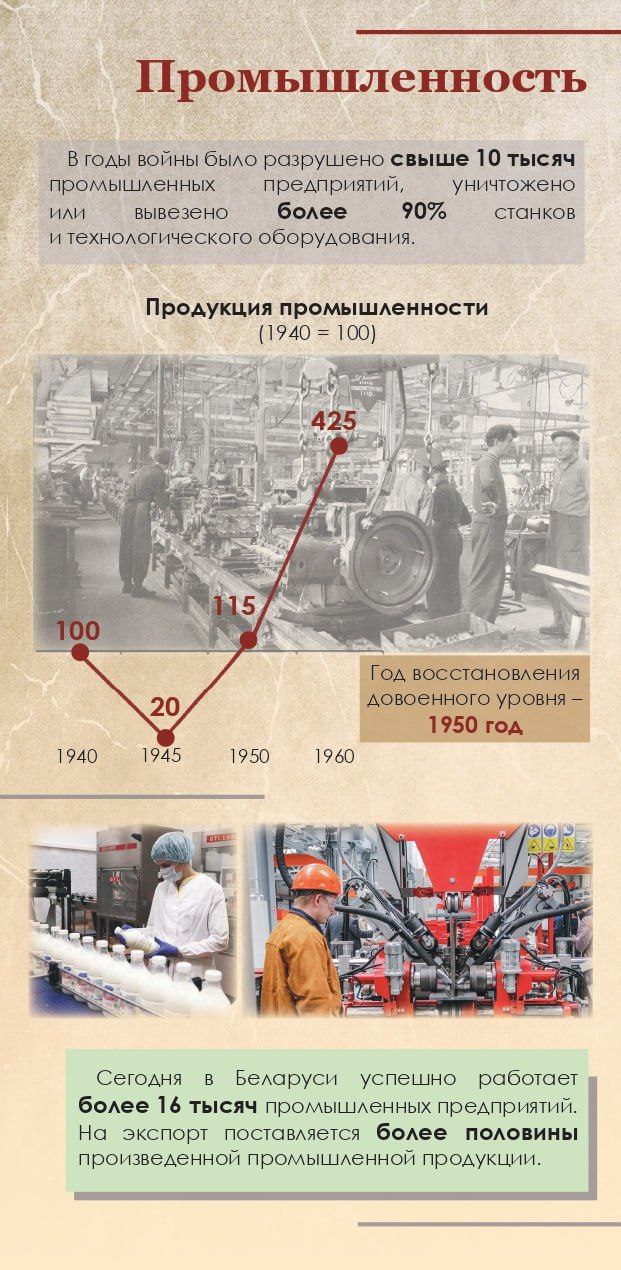 За время ВОВ разрушено более 10 тысяч предприятий, уничтожено или вывезено 90% станков и оборудования. Восстановить этот уровень удалось к 1950 году.