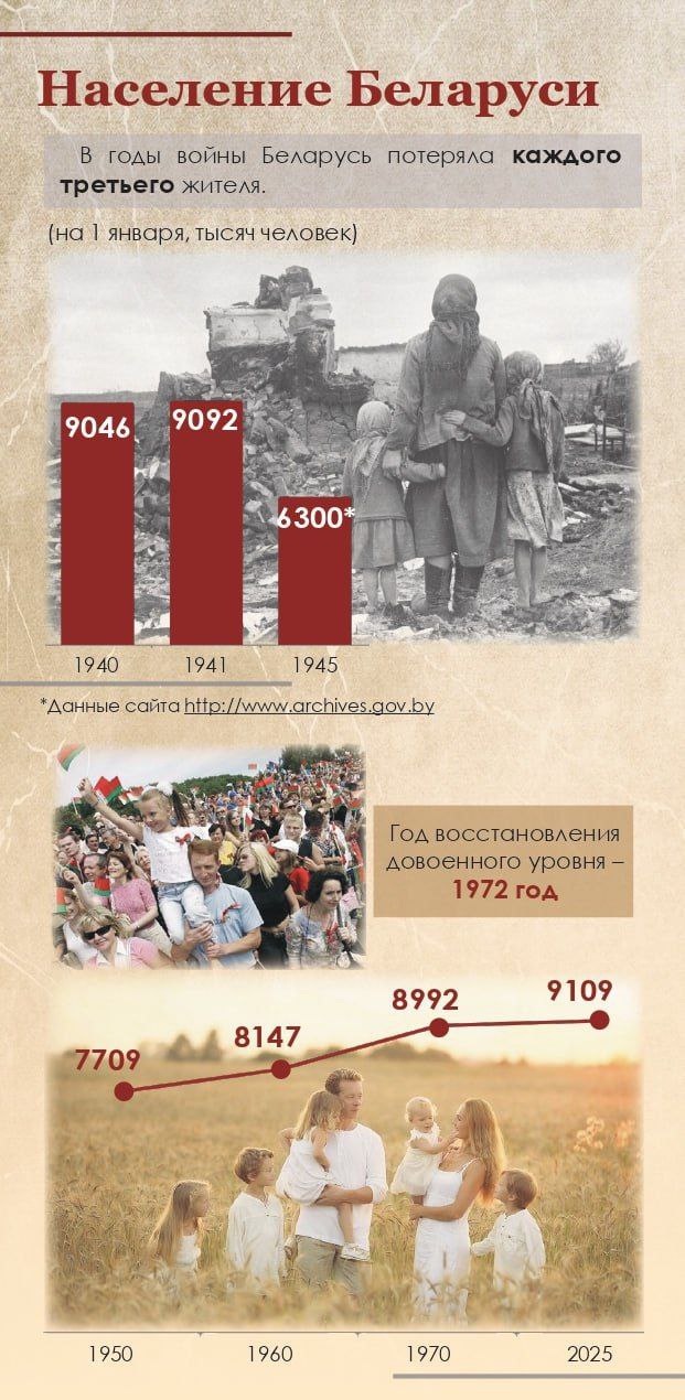 В годы войны Беларусь потеряла каждого третьего жителя. В 1941 году в Беларуси проживали 9 млн 92 тысячи человек, а в 1945 — 6,3 млн. Восстановить довоенный уровень населения удалось лишь в 1972 году.