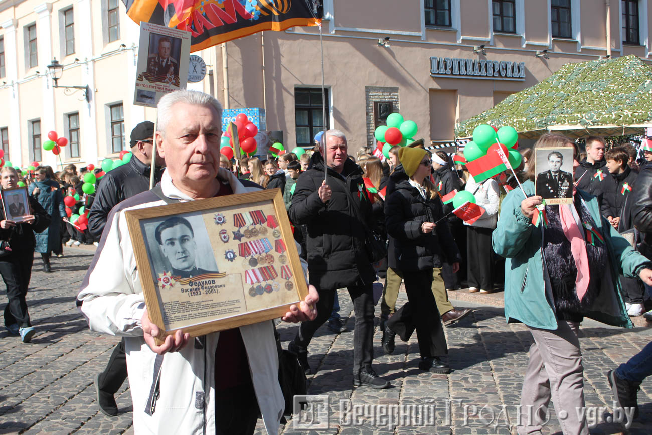 Затем по центру Гродно прошли несколько десятков тысяч гродненцев. Акция «Беларусь помнит» стала самой массовой за всю историю ее проведения. Около часа понадобилось, чтобы прошли все участники до площади Ленина. Люди несли портреты своих родственников — ветеранов Великой отечественной войны.