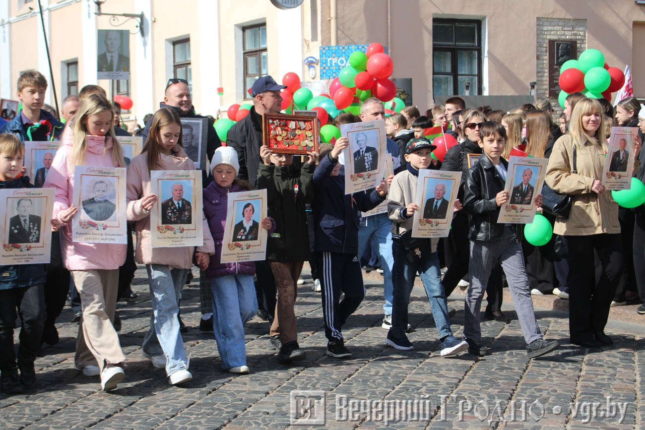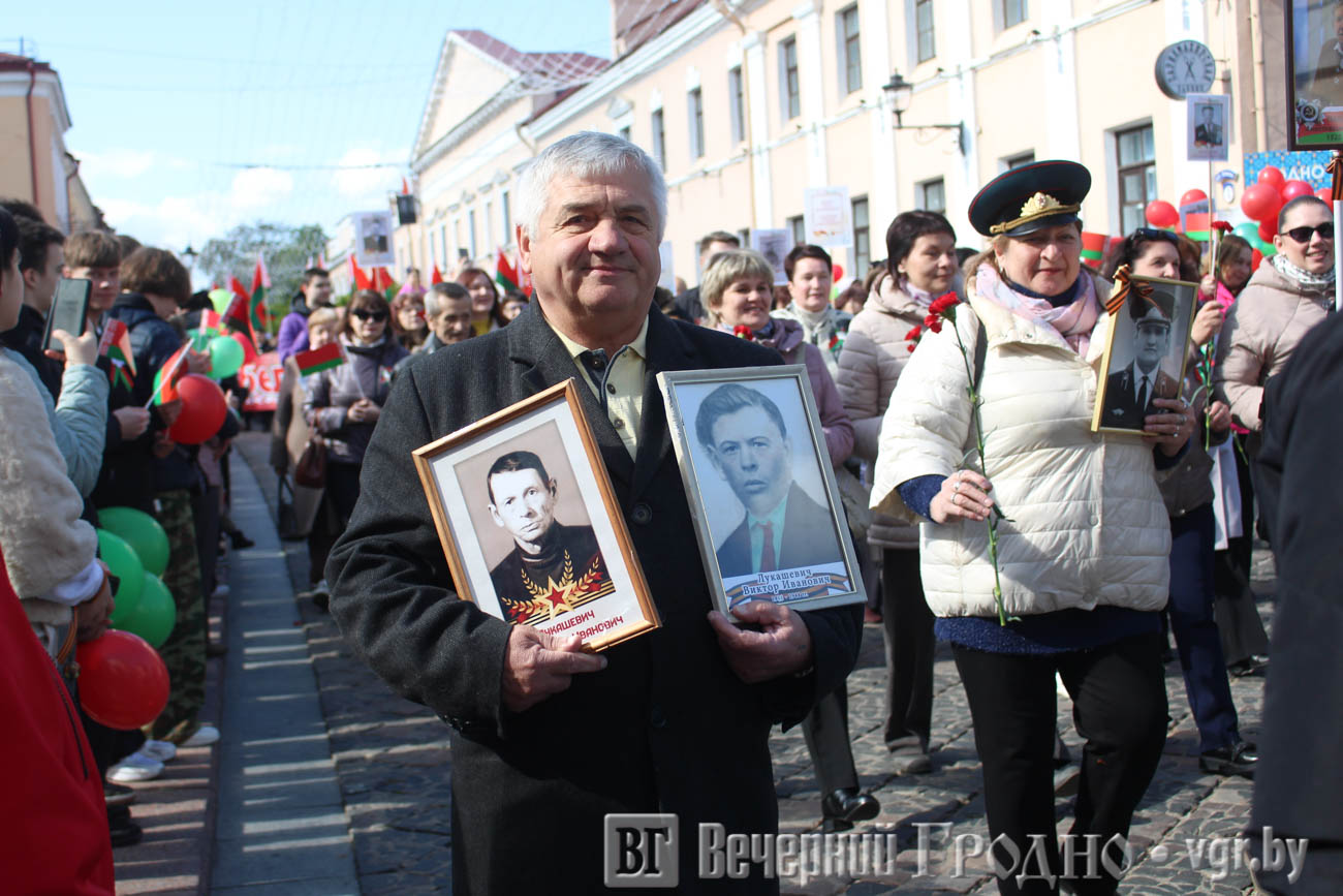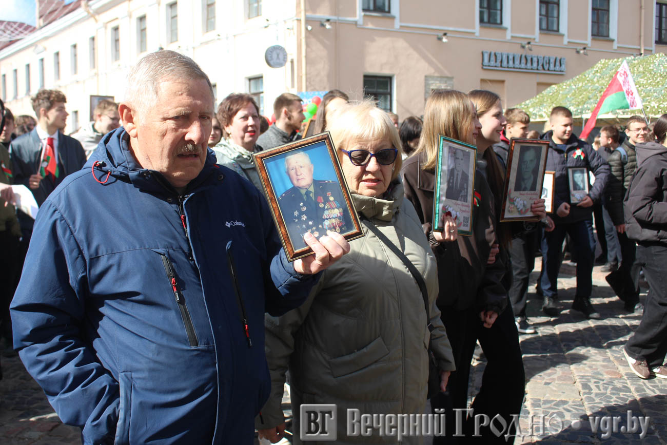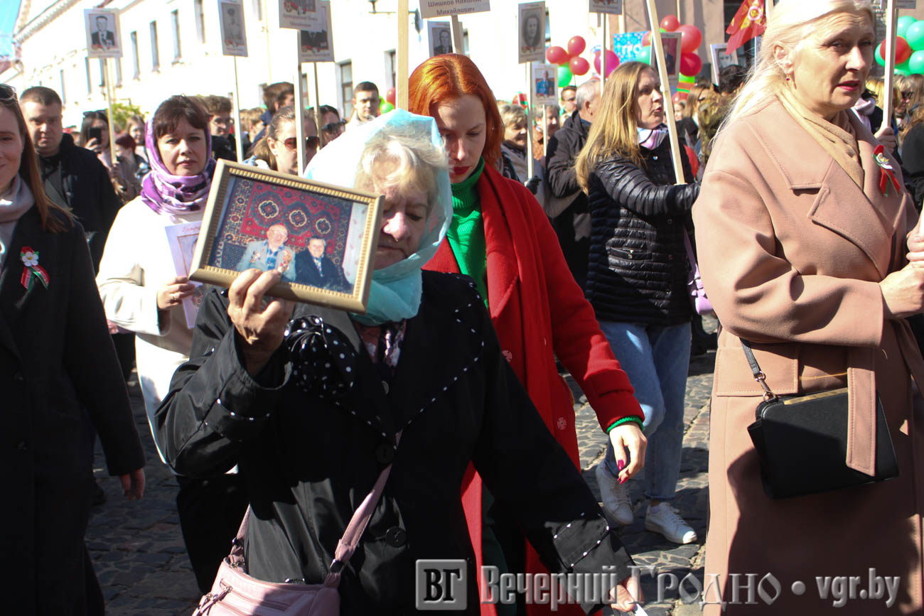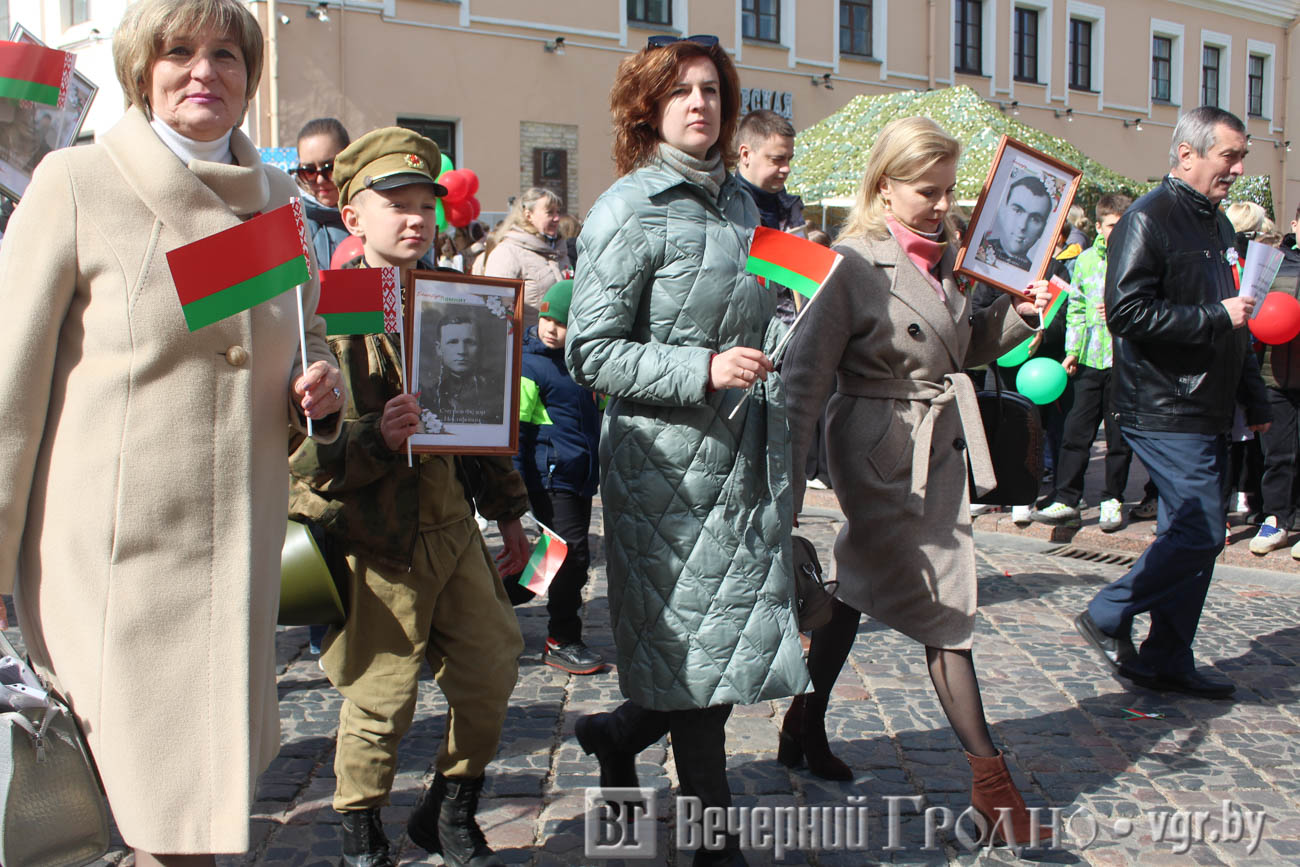 Затем по центру Гродно прошли несколько десятков тысяч гродненцев. Акция «Беларусь помнит» стала самой массовой за всю историю ее проведения. Около часа понадобилось, чтобы прошли все участники до площади Ленина. Люди несли портреты своих родственников — ветеранов Великой отечественной войны.