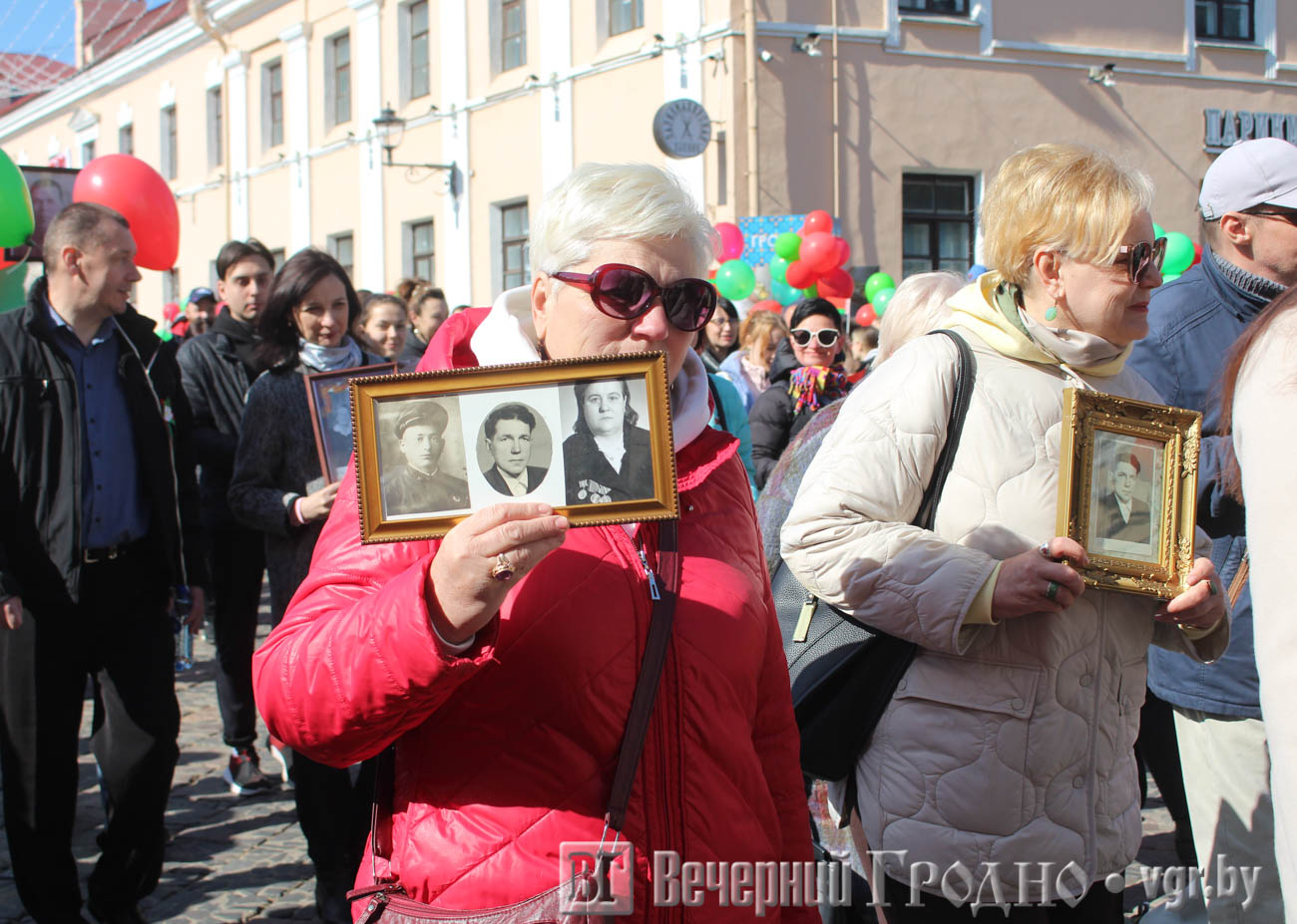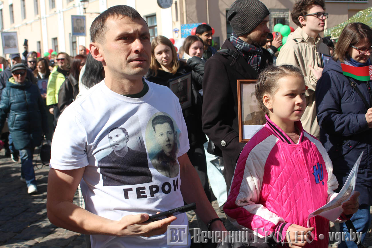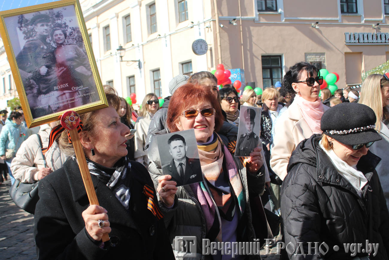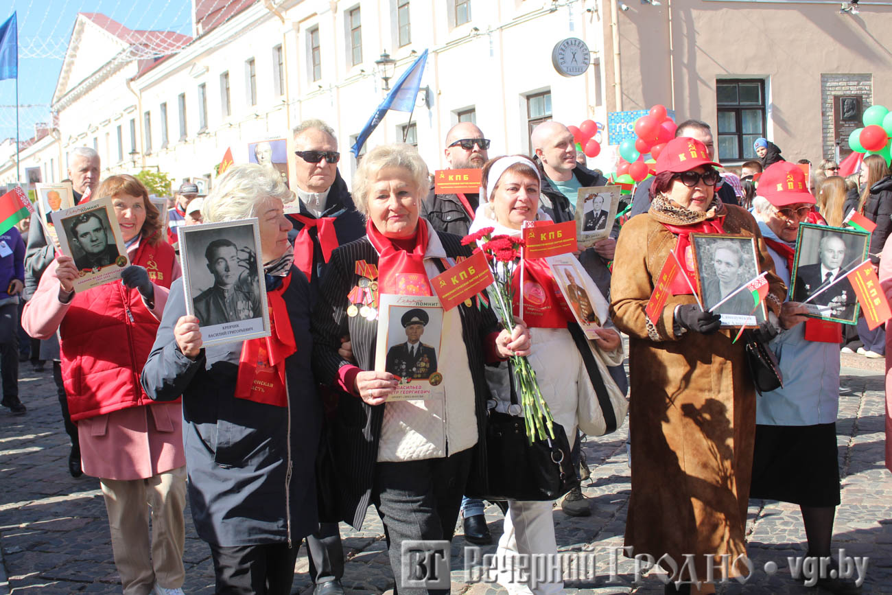 Затем по центру Гродно прошли несколько десятков тысяч гродненцев. Акция «Беларусь помнит» стала самой массовой за всю историю ее проведения. Около часа понадобилось, чтобы прошли все участники до площади Ленина. Люди несли портреты своих родственников — ветеранов Великой отечественной войны.