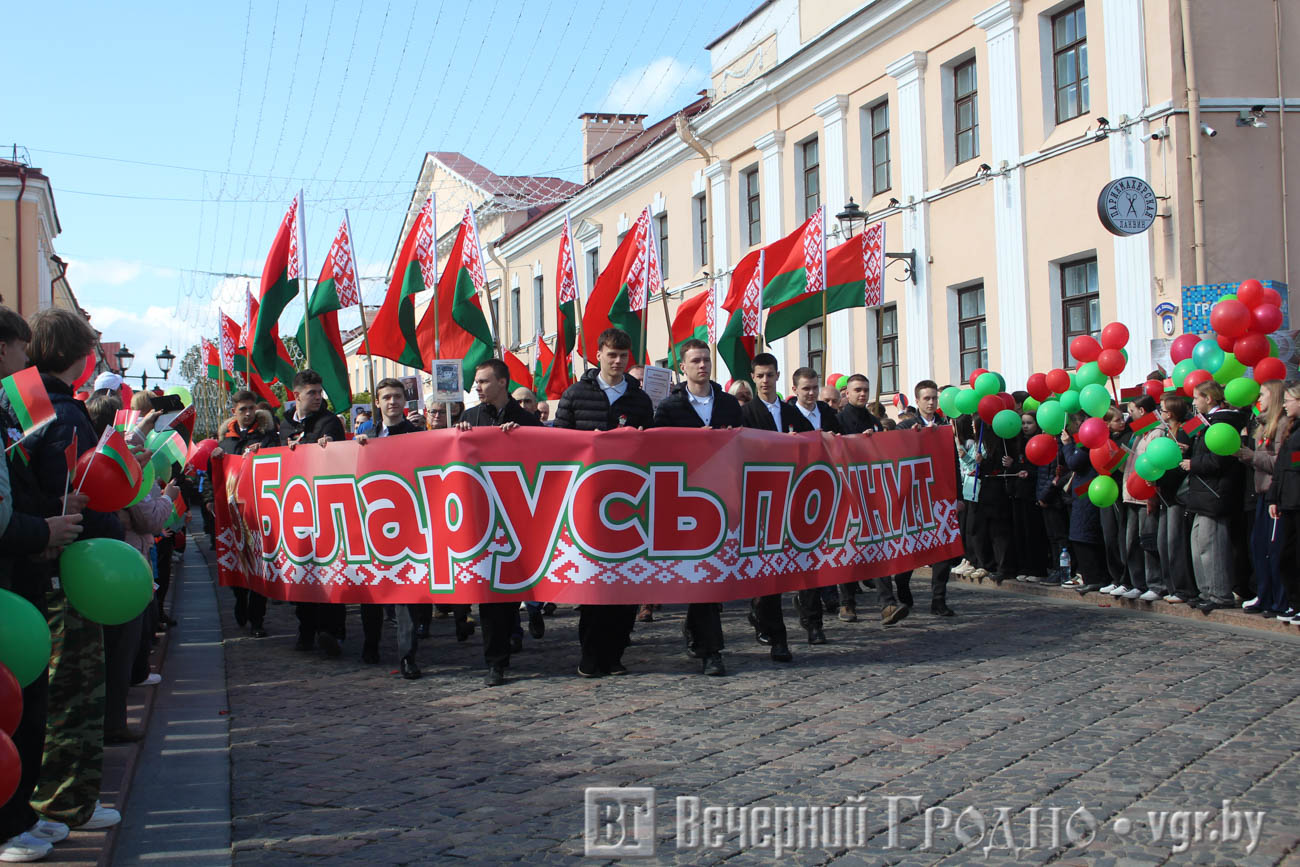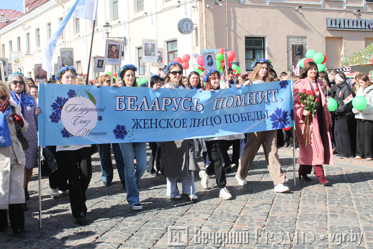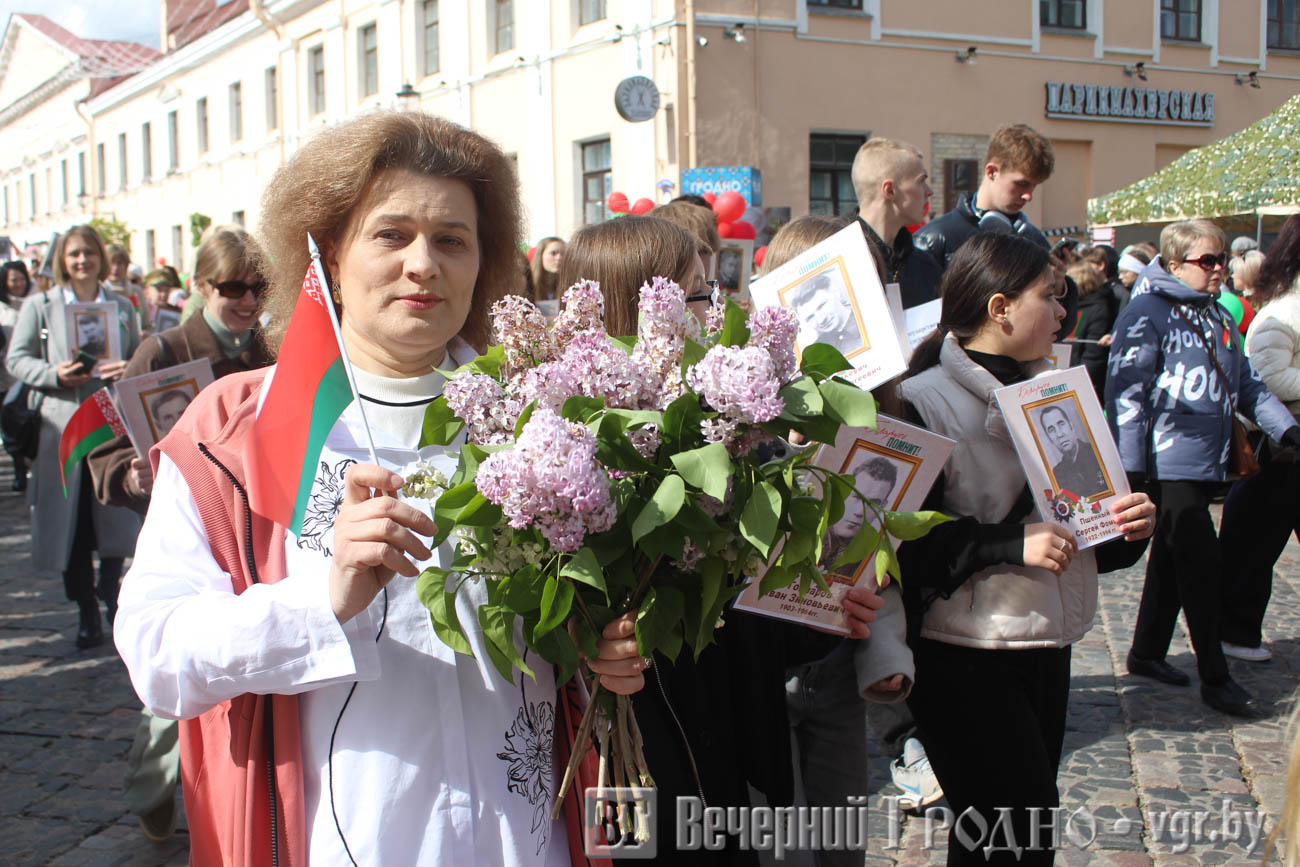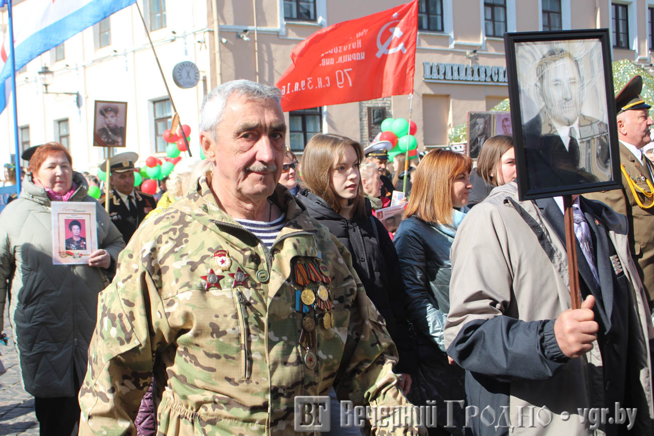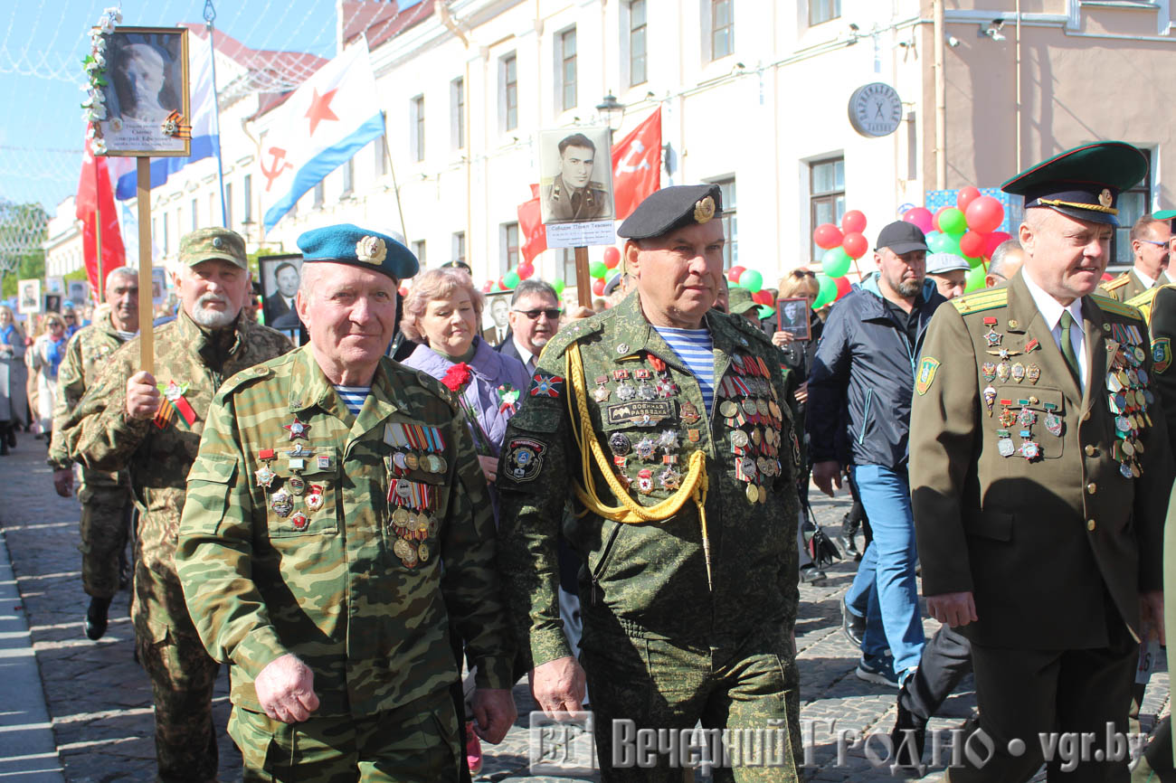 Затем по центру Гродно прошли несколько десятков тысяч гродненцев. Акция «Беларусь помнит» стала самой массовой за всю историю ее проведения. Около часа понадобилось, чтобы прошли все участники до площади Ленина. Люди несли портреты своих родственников — ветеранов Великой отечественной войны.