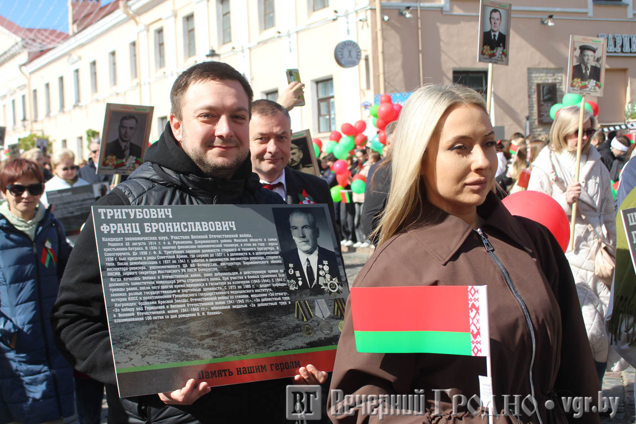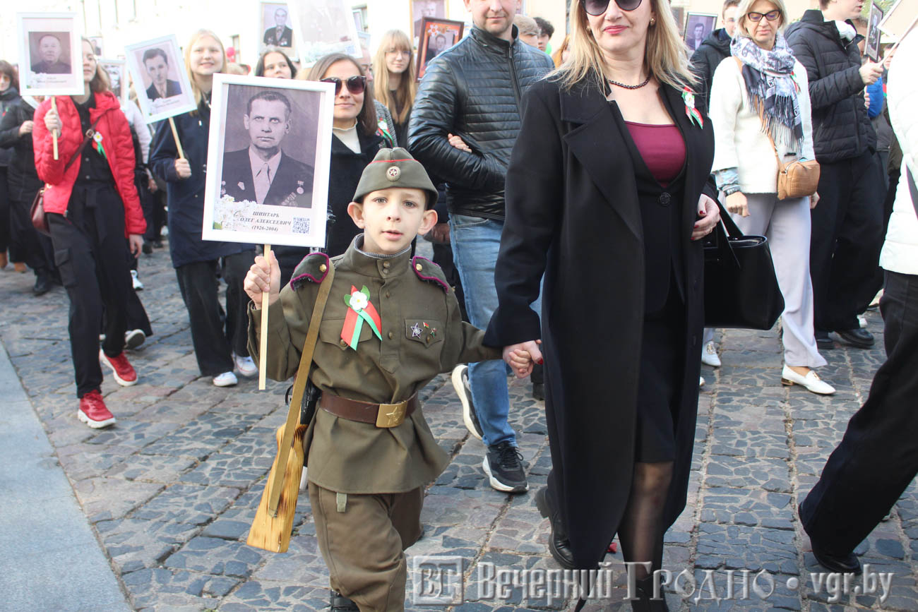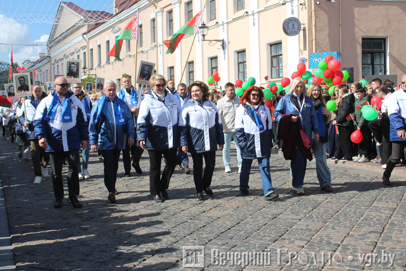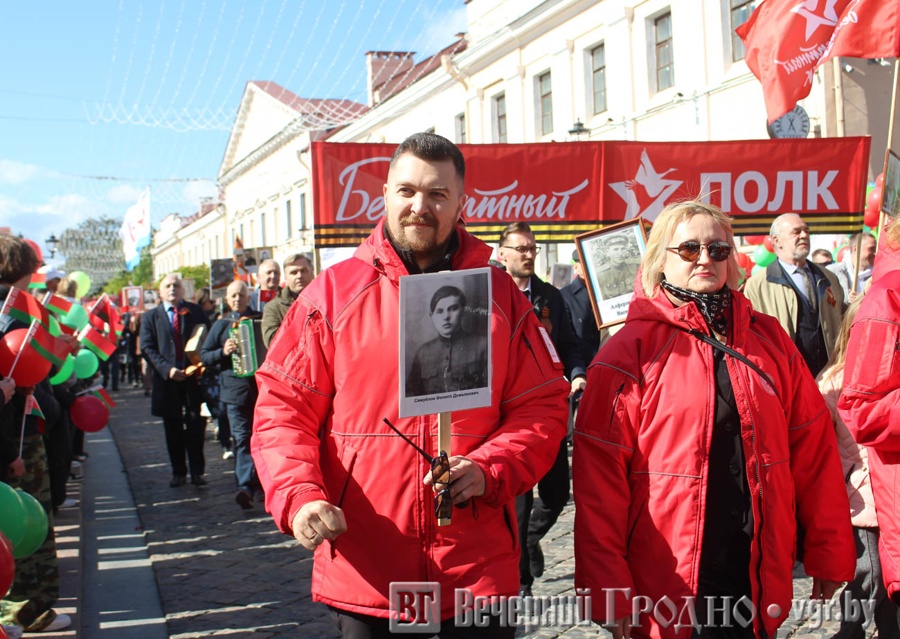 Затем по центру Гродно прошли несколько десятков тысяч гродненцев. Акция «Беларусь помнит» стала самой массовой за всю историю ее проведения. Около часа понадобилось, чтобы прошли все участники до площади Ленина. Люди несли портреты своих родственников — ветеранов Великой отечественной войны.