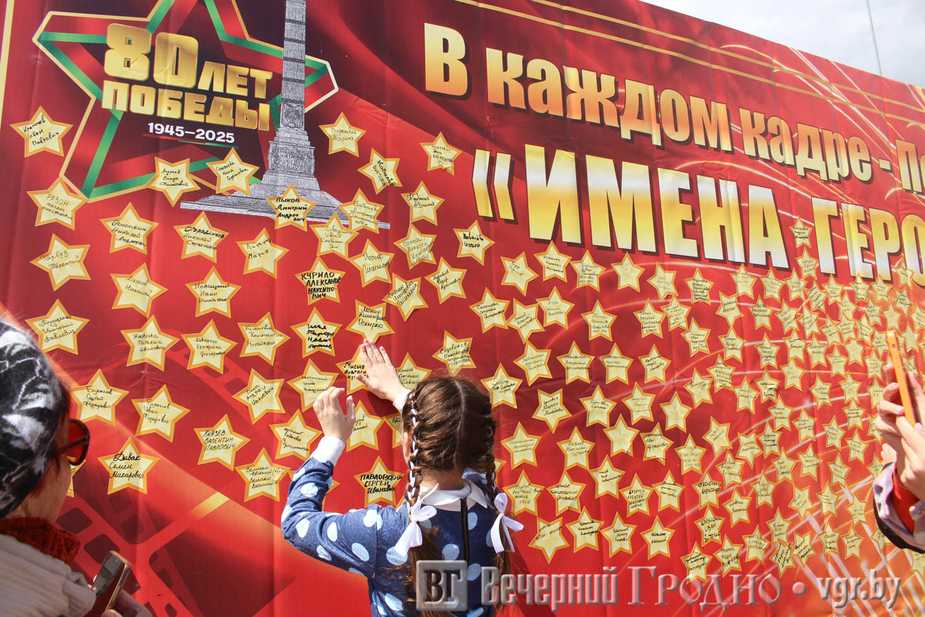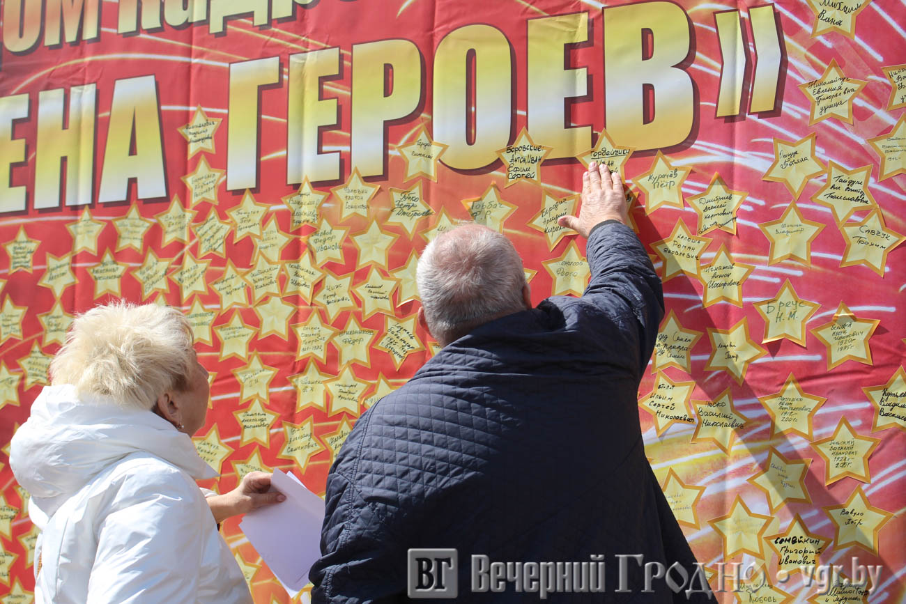 На площади Ленина установили баннер «Имена героев», где все желающие могли написать и наклеить имя своих родственников-ветеранов.