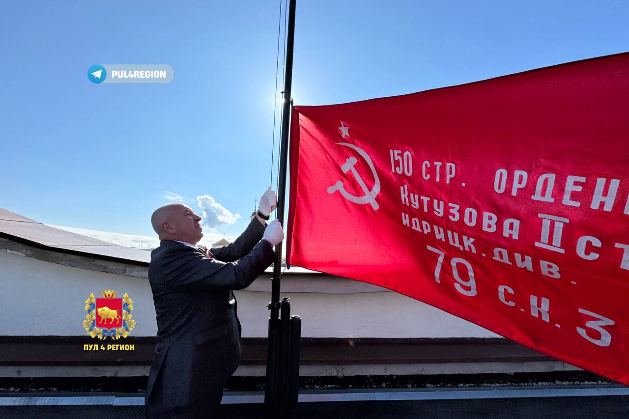 Председатель Гродненского облисполкома Юрий Караев поднял над драмтеатром копию Знамя Победы.