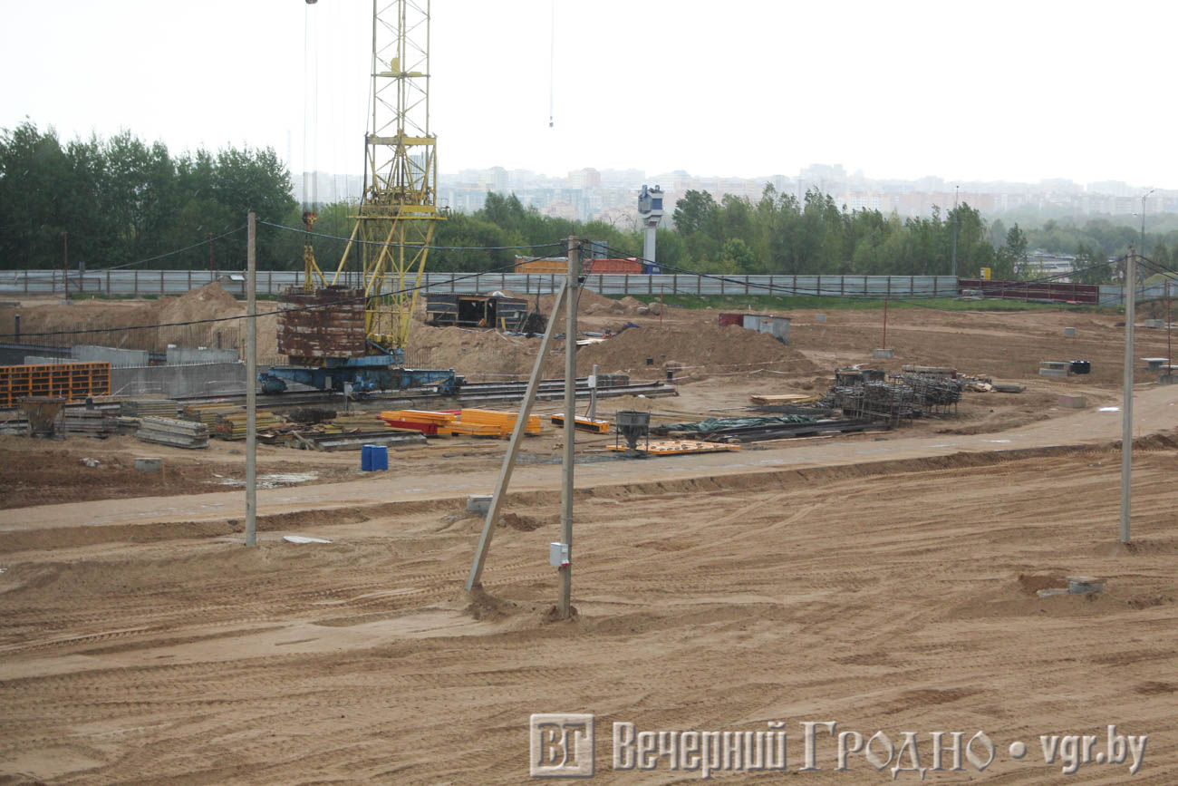 Сейчас видны очертания будущих трибун. Мы снимали со стороны Скидельского шоссе. Судя по проекту, это и есть самая большая площадка, вмещающая 2000 зрителей.