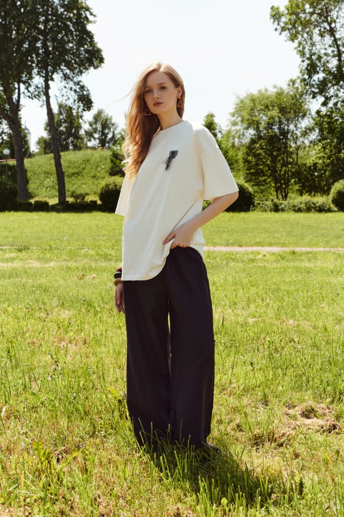 В коллекции представлены воздушные платья прямого силуэта, подчеркивающие естественную красоту, женственные платья-футляры с вырезом на спине, мягкие футболки, акцентные рубашки и топы и комплекты с брюками и шортами — удобные ансамбли, которые легко комбинируются между собой и создают расслабленный, но собранный образ. Лаконичные линии, продуманная посадка, идеальный баланс между мягкостью и структурой — всё это создаёт капсульный выразительный гардероб.