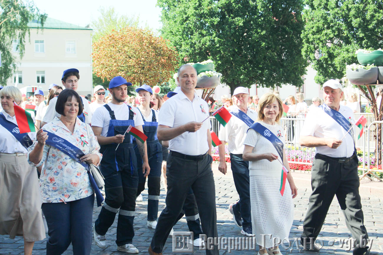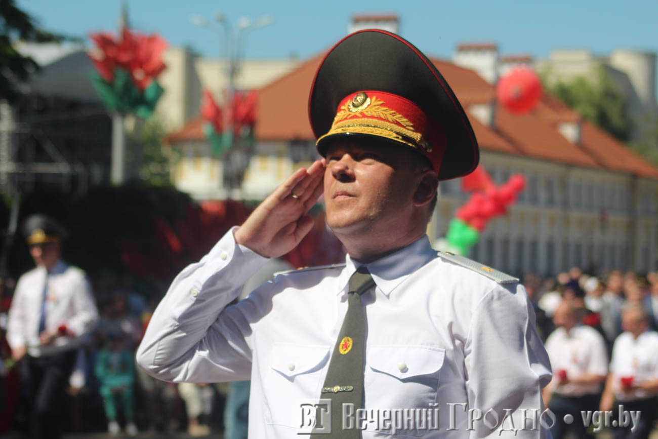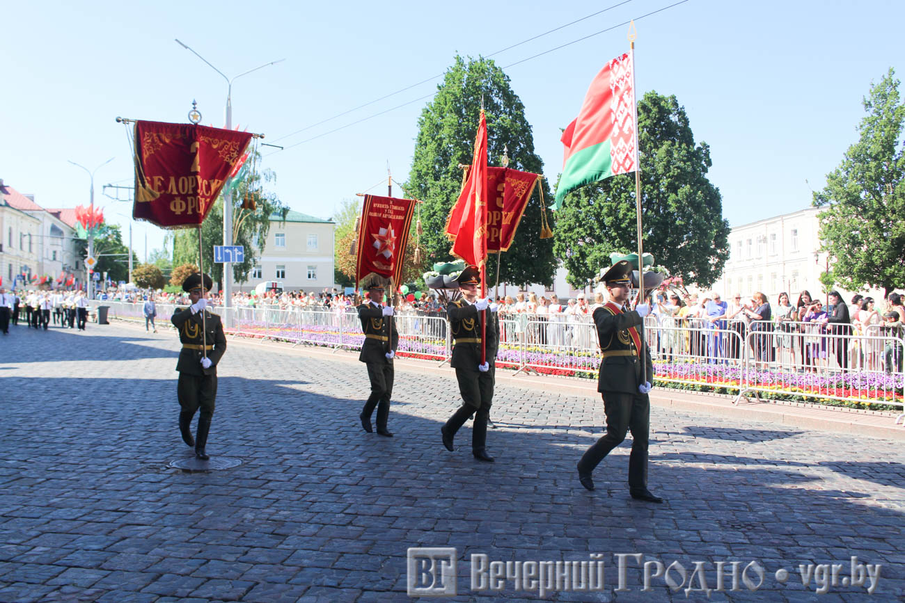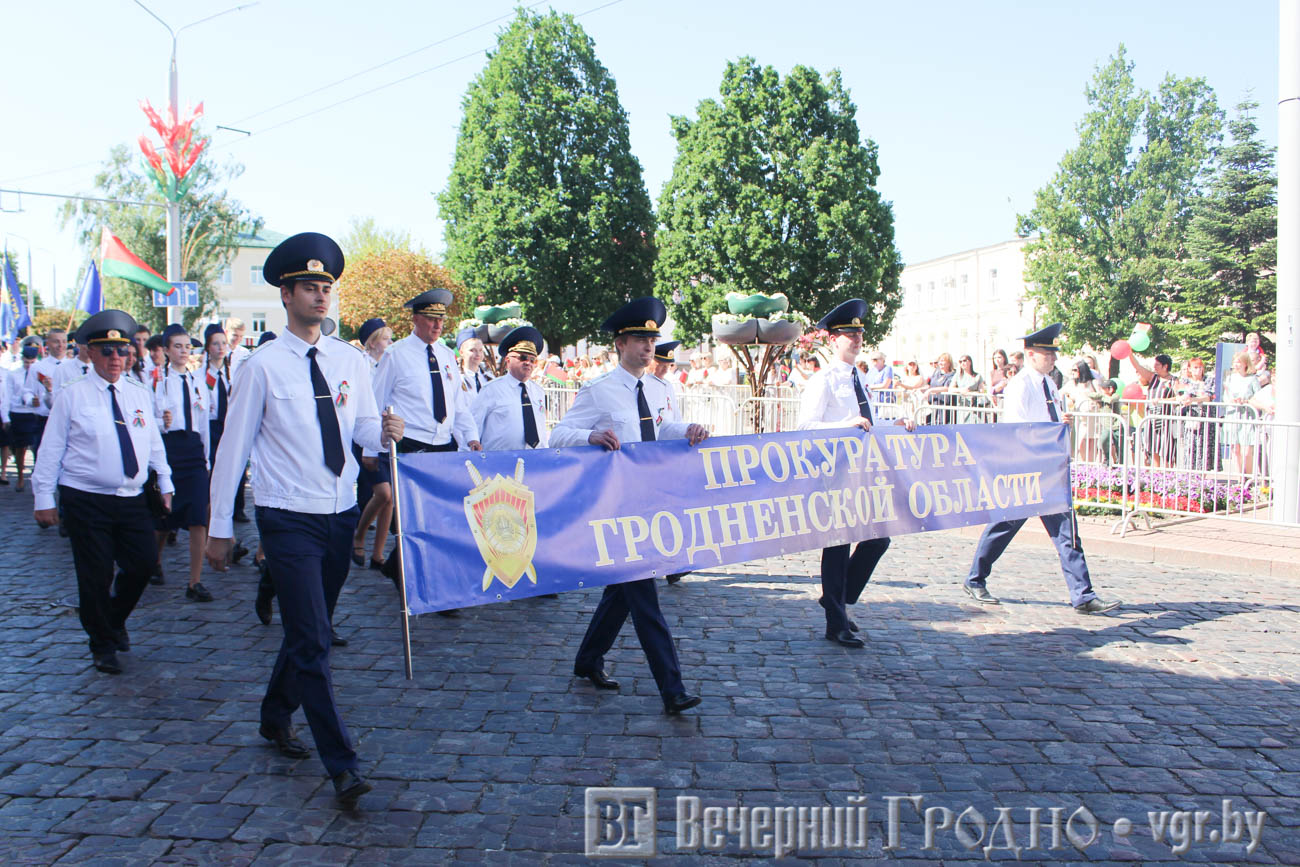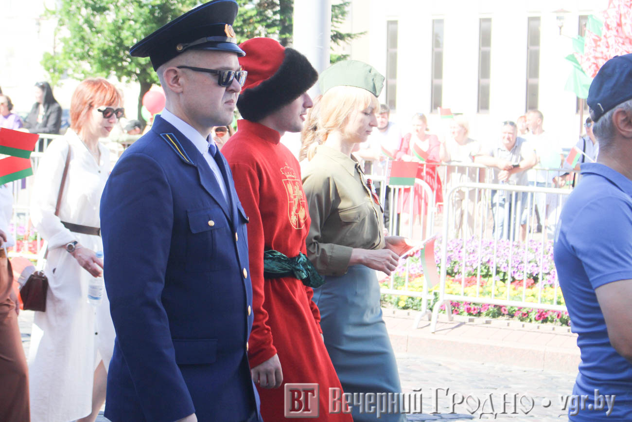 День Независимости начался с шествия поколений. С улицы Социалистической на площадь Ленина прошли представители силовых структур и ведомств, организаций и предприятий города, а также Почетные граждане Гродно.