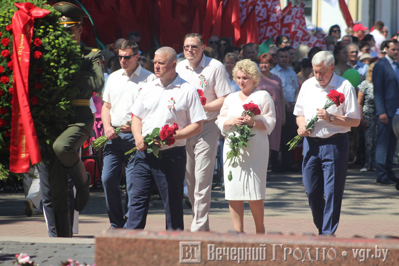 На площади Ленина состоялся митинг. Обращаясь к гродненцам, председатель Гродненского облисполкома Юрий Караев отметил, что День Независимости – это олицетворение свободы, гордости и достоинства нашего народа: