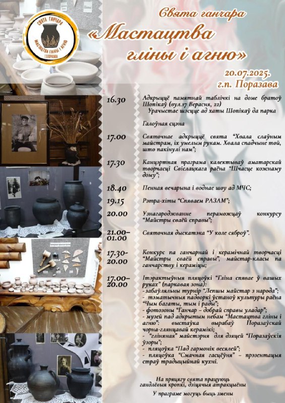 В рамках мероприятия пройдет конкурс по гончарному и керамическому творчеству «Мастера своего дела» в нескольких номинациях: «Лучшая домашняя коллекция» (гончары), «Лучшее гончарное изделие» (изготовление посуды), «Лучшая игрушка» (керамисты), «Лучшая фантазийная композиция» (керамисты), пишет телеграм-канал «Культура Гродненщины».