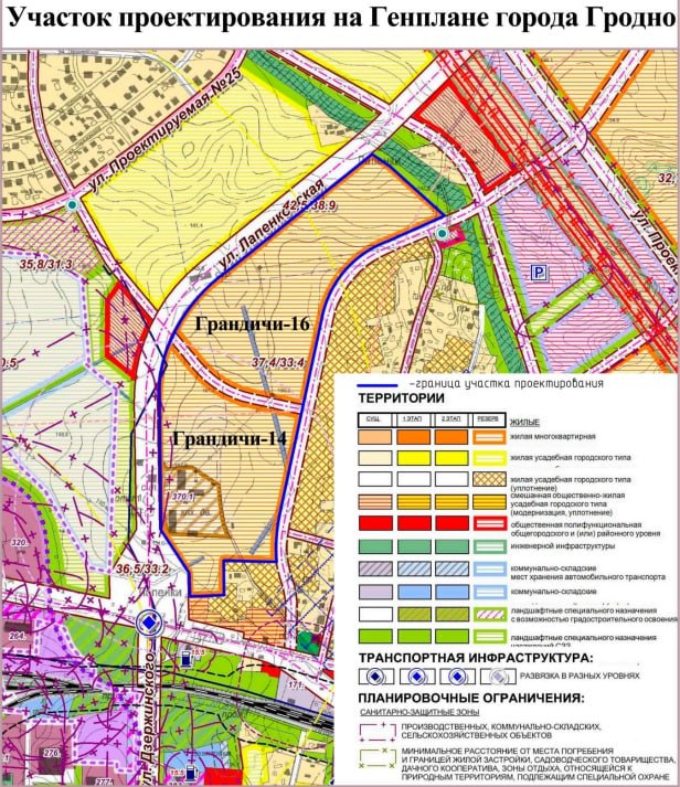 Согласно документу, застроить планируют участок площадью примерно 40 гектаров. С северо-запада и запада он граничит с Лапенковской улицей, с северо-востока — с перспективной улицей Проектируемая № 27 и перспективным районом общественной застройки «Грандичи-13», с юга — с улицей Проектируемая № 1, с востока — с перспективной улица категории Б, существующей усадебной застройкой и кварталом перспективной жилой усадебной застройки «Грандичи-15», сообщает горисполком.