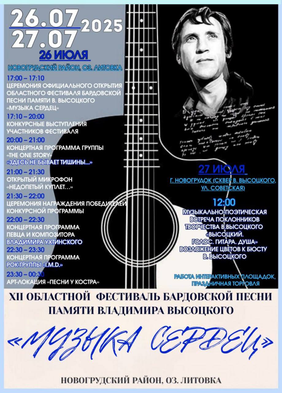 XII областной фестиваль бардовской и авторской песни памяти Владимира Высоцкого песни «Музыка сердец» пройдёт 26 июля на озере Литовка Новогрудского района. Начало в 17:00.