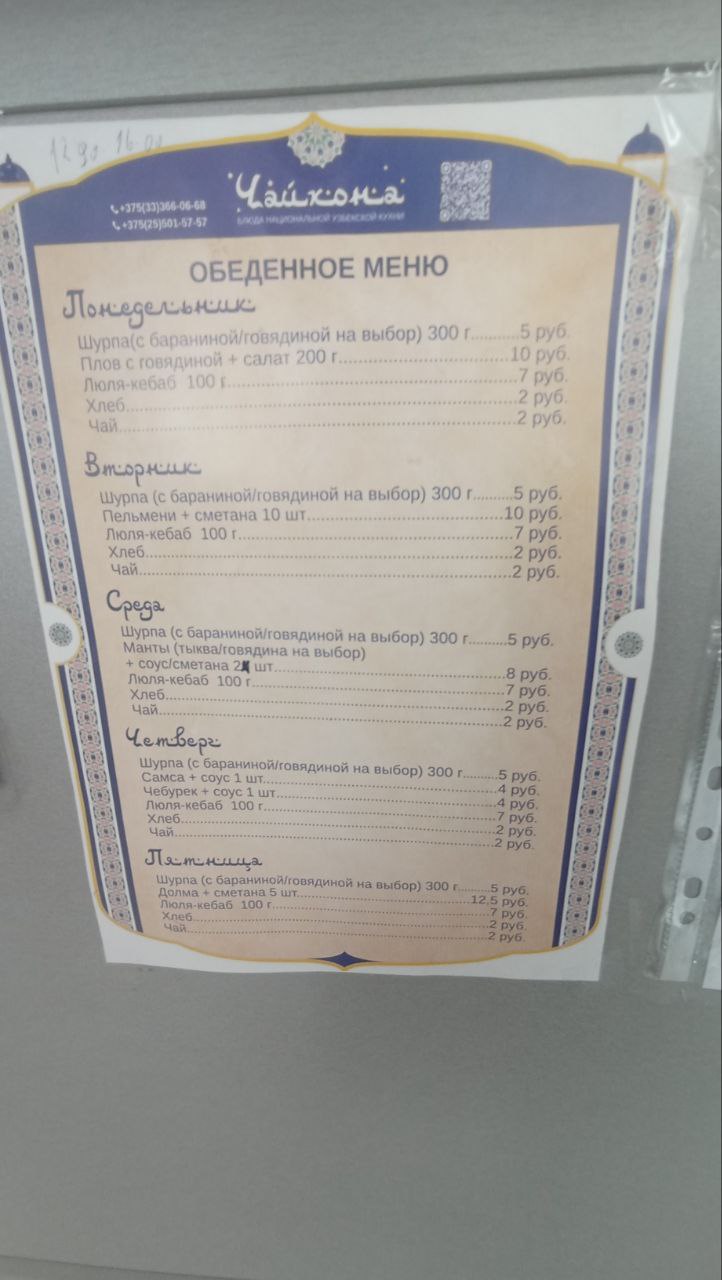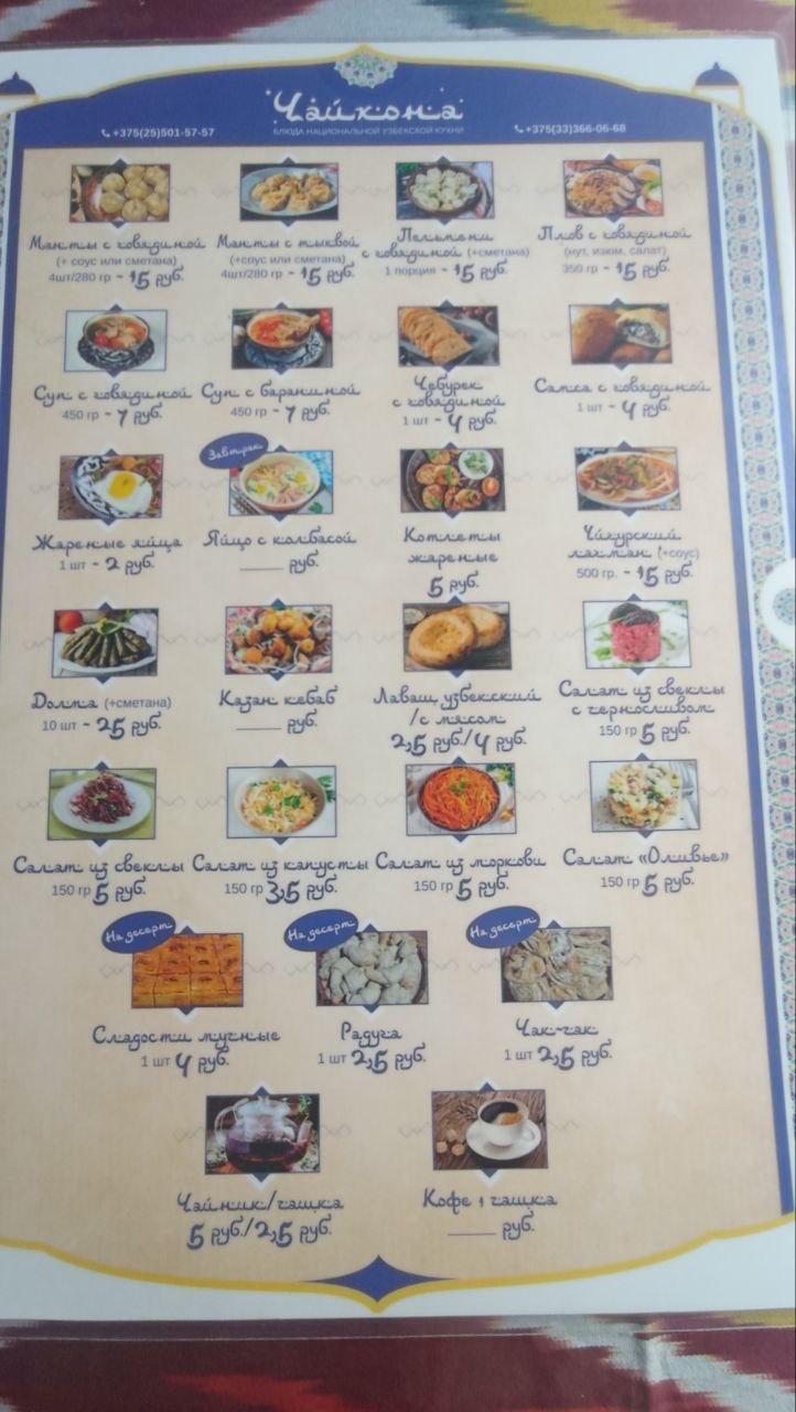 Все блюда из меню можно заказать себе на любое торжество. Чайхана находится в центре Гродно по адресу Карла Маркса, 10. Телефон для заказа блюд: +375 (33) 366-06-68, шеф-повар: +375 25 501 57 57.