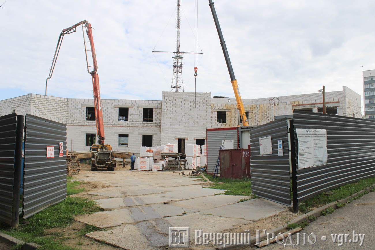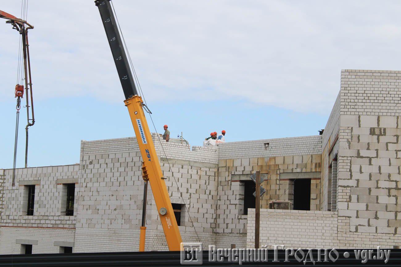 На улице Горького, недалеко от кольцевой развязки, продолжается строительство здания общепита. Здесь уже возвели коробку, проводятся работы на крыше будущего объекта.