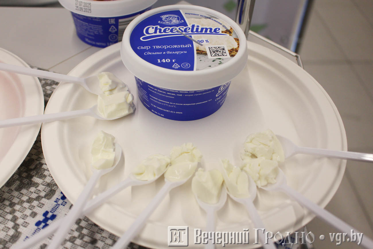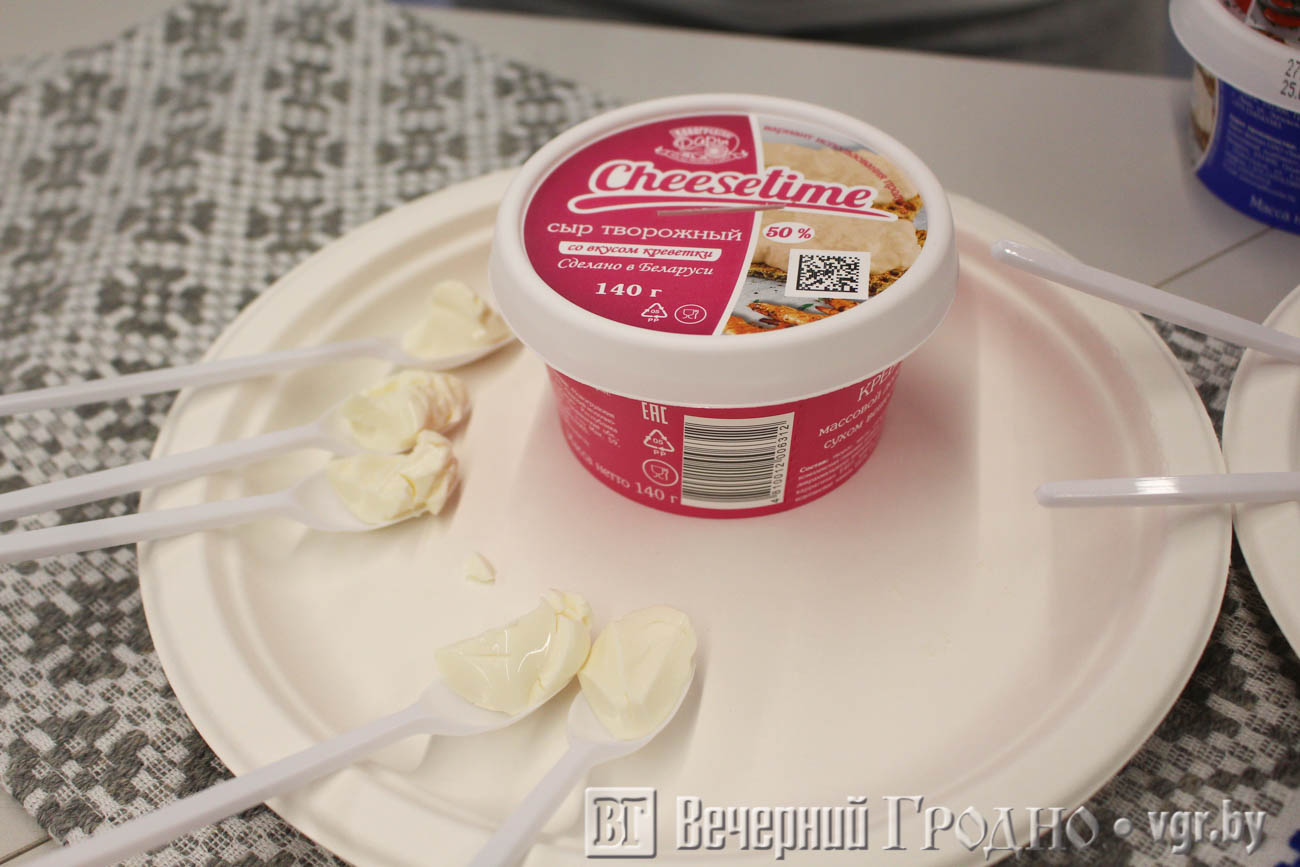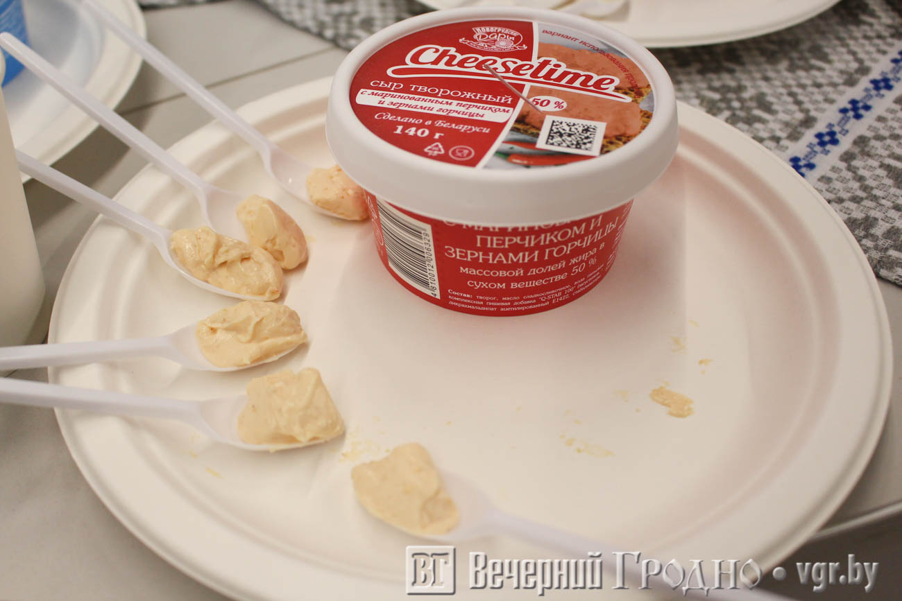 Посетители «Евроопта» продегустировали творожные десерты с наполнителями груши, манго и ванили, творожные глазированные сырки, а также творожный сыр со вкусом маринованного перчика и зернами горчицы, со вкусом креветки и классический.
