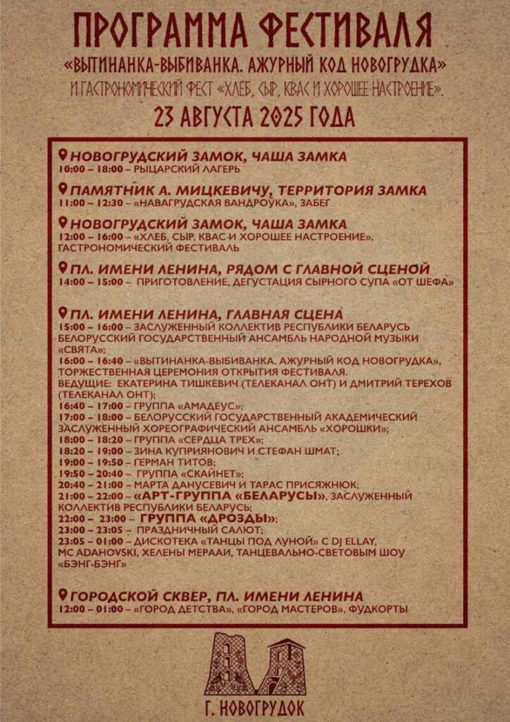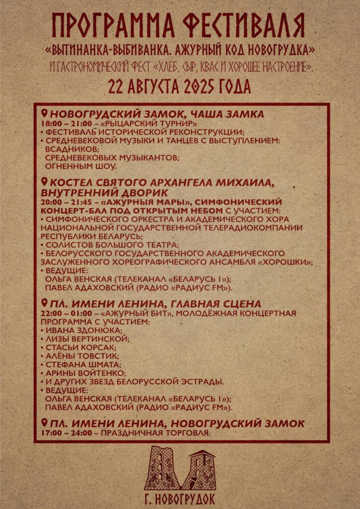 Гостей праздника ждет большая развлекательная программа: гастрономический фестиваль, симфонический концерт-бал и концерты. В пятницу, 22 августа, на территории новогрудского замка состоится рыцарский турнир и огненное шоу, а на площади Ленина пройдет концерт звезд белорусской эстрады.
