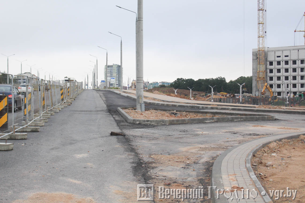 Со стороны проспекта Янки Купалы на дороге появились дополнительные полосы для въезда и выезда с территории будущей больницы. Коме того, здесь тротуарной плиткой уложили дорожки и установили красивые фонари.