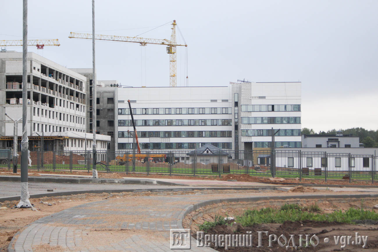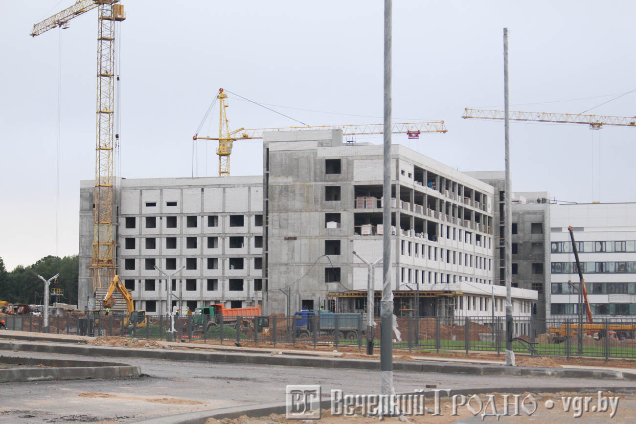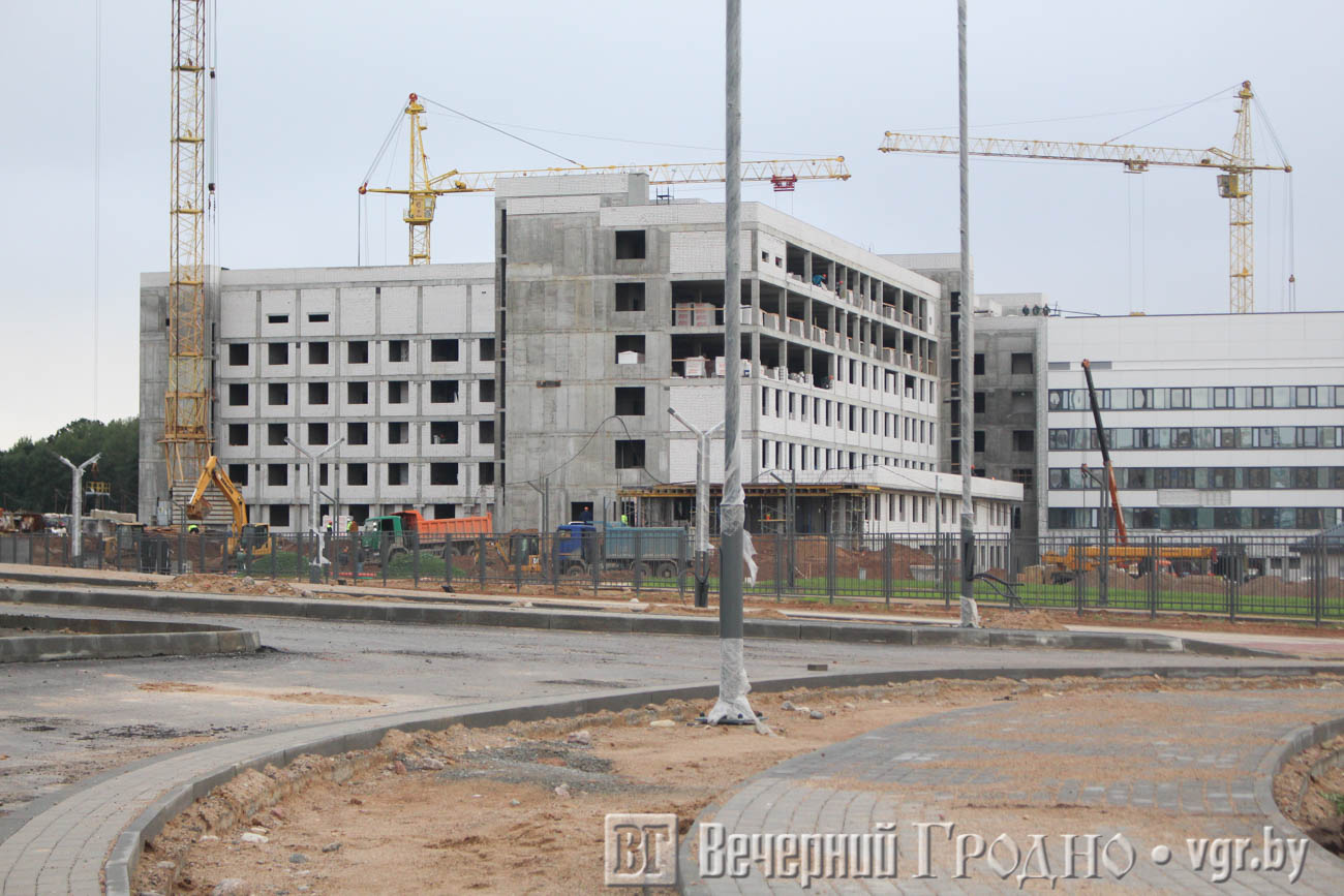 В Гродно на проспекте Янки Купалы продолжается строительство новой больницы. Одновременно с работами на объекте специалисты благоустраивают прилегающую территорию.
