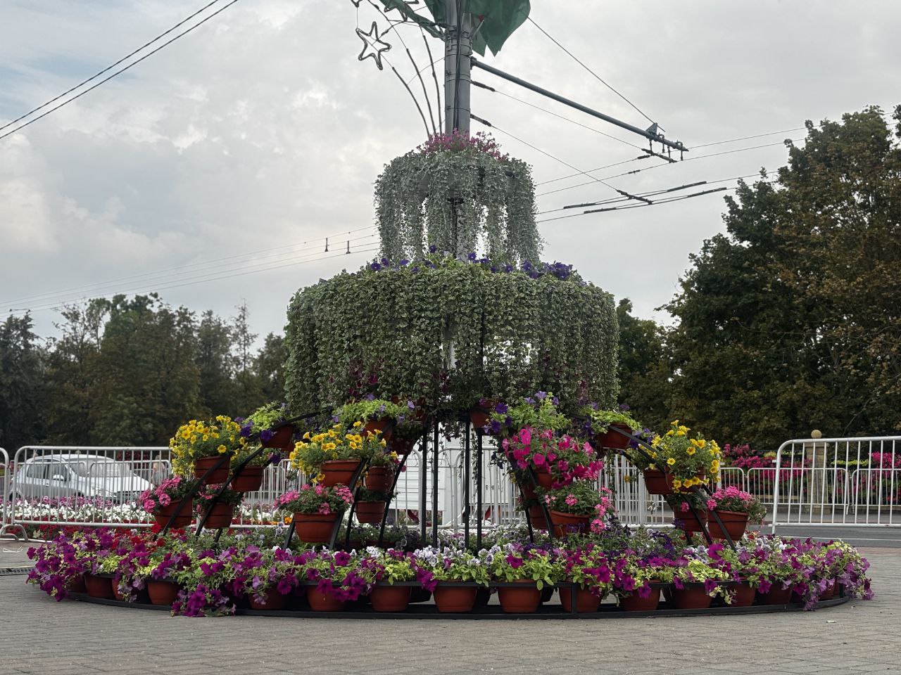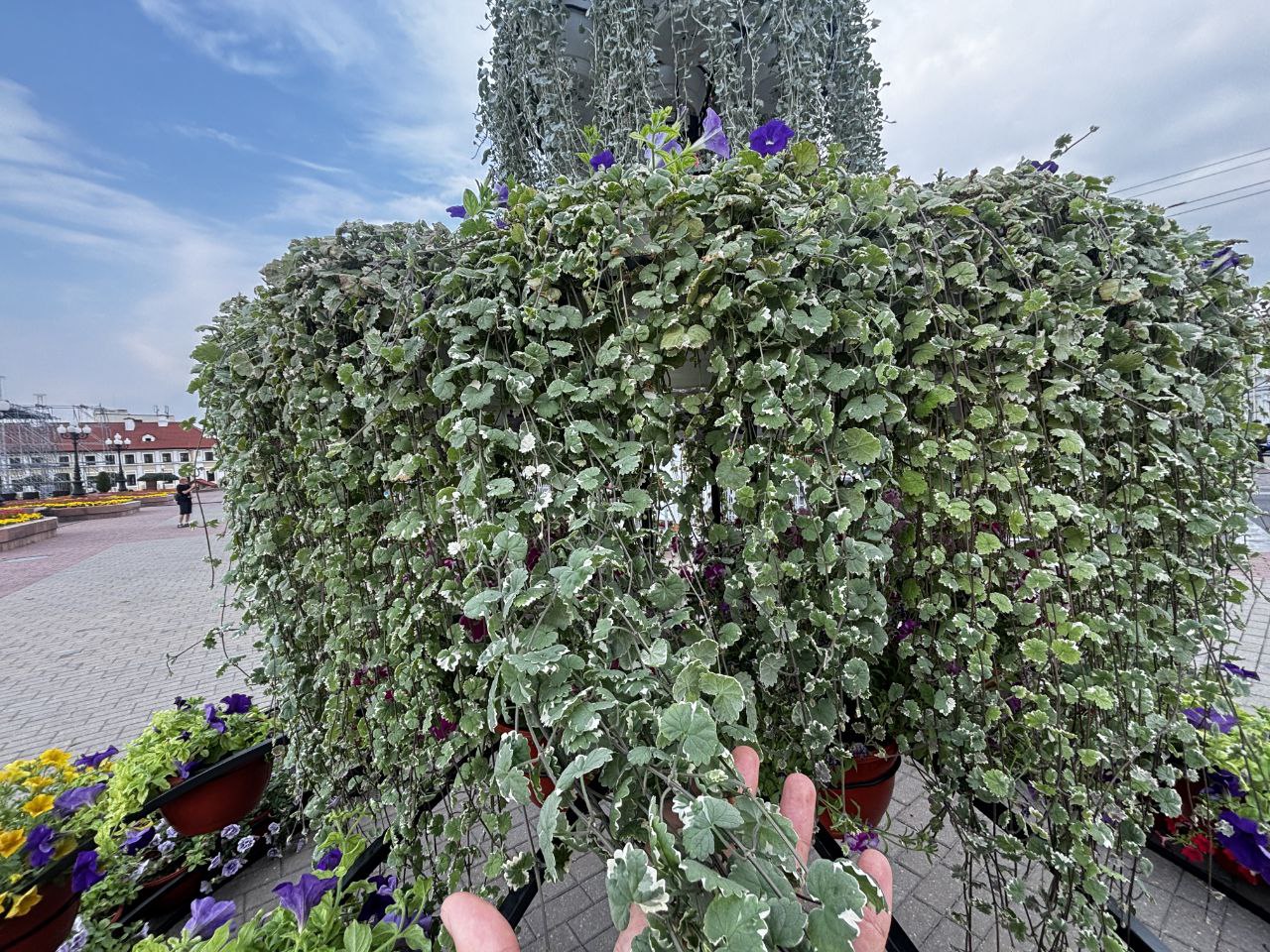 Фонтан состоит из цветов, среди которых сурфиния разных видов и расцветки (крупноцветковая, мелкоцветковая, махровая), дихондра серебристый водопад, будра вариагатная, вербена. На самом верху экспозиции — миллионный цветок, которым украсили Гродно.