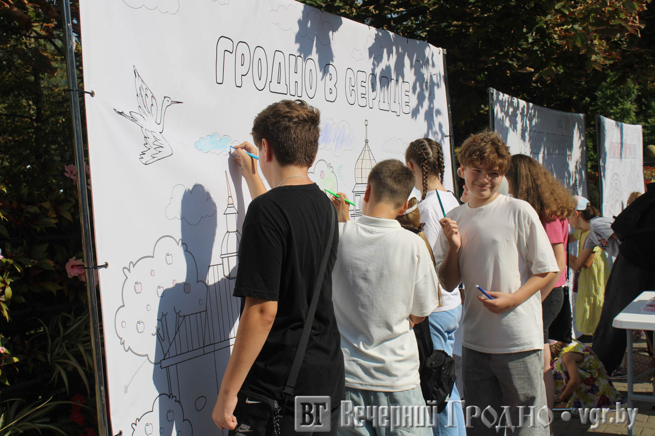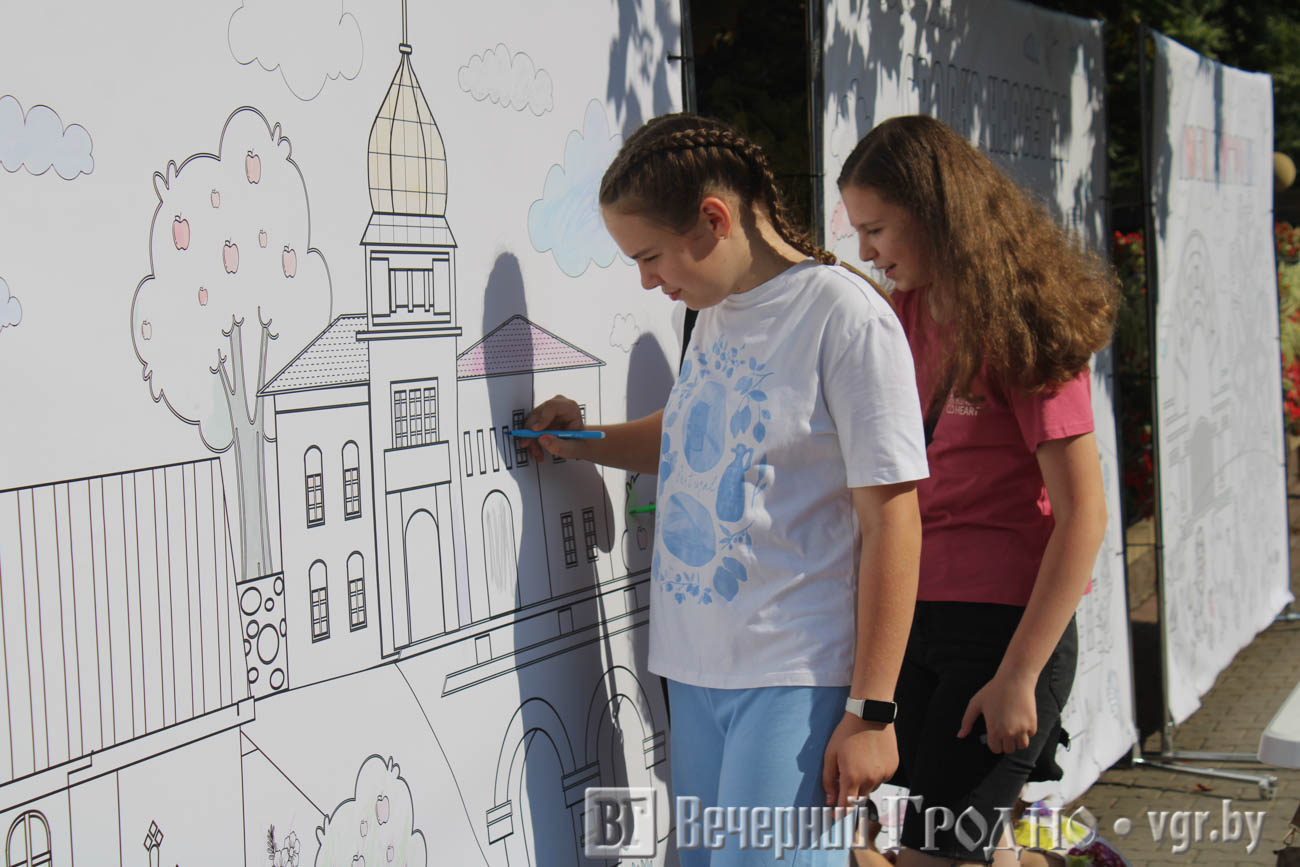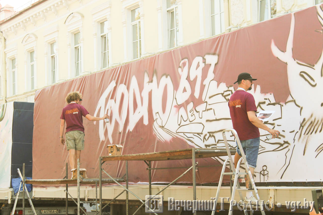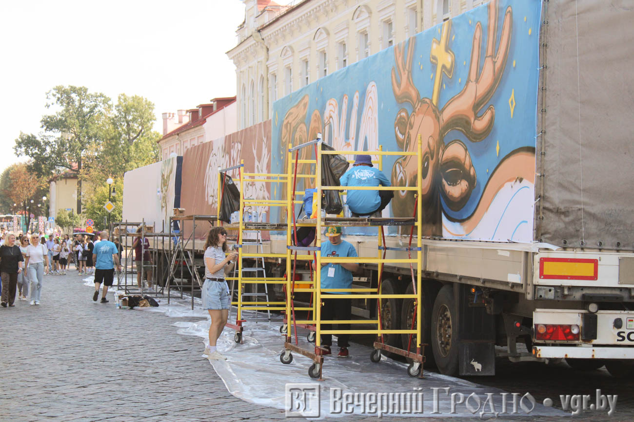 В центр города пригнали три фуры — их предоставил грузовой автопарк №1. На них натянули панно, которые к вечеру разрисуют. Там изобразят оленя Святого Губерта, панораму Гродно, а также напишут название города, дату его основания и цифры «897» — именно столько исполнилось нашему областному центру.