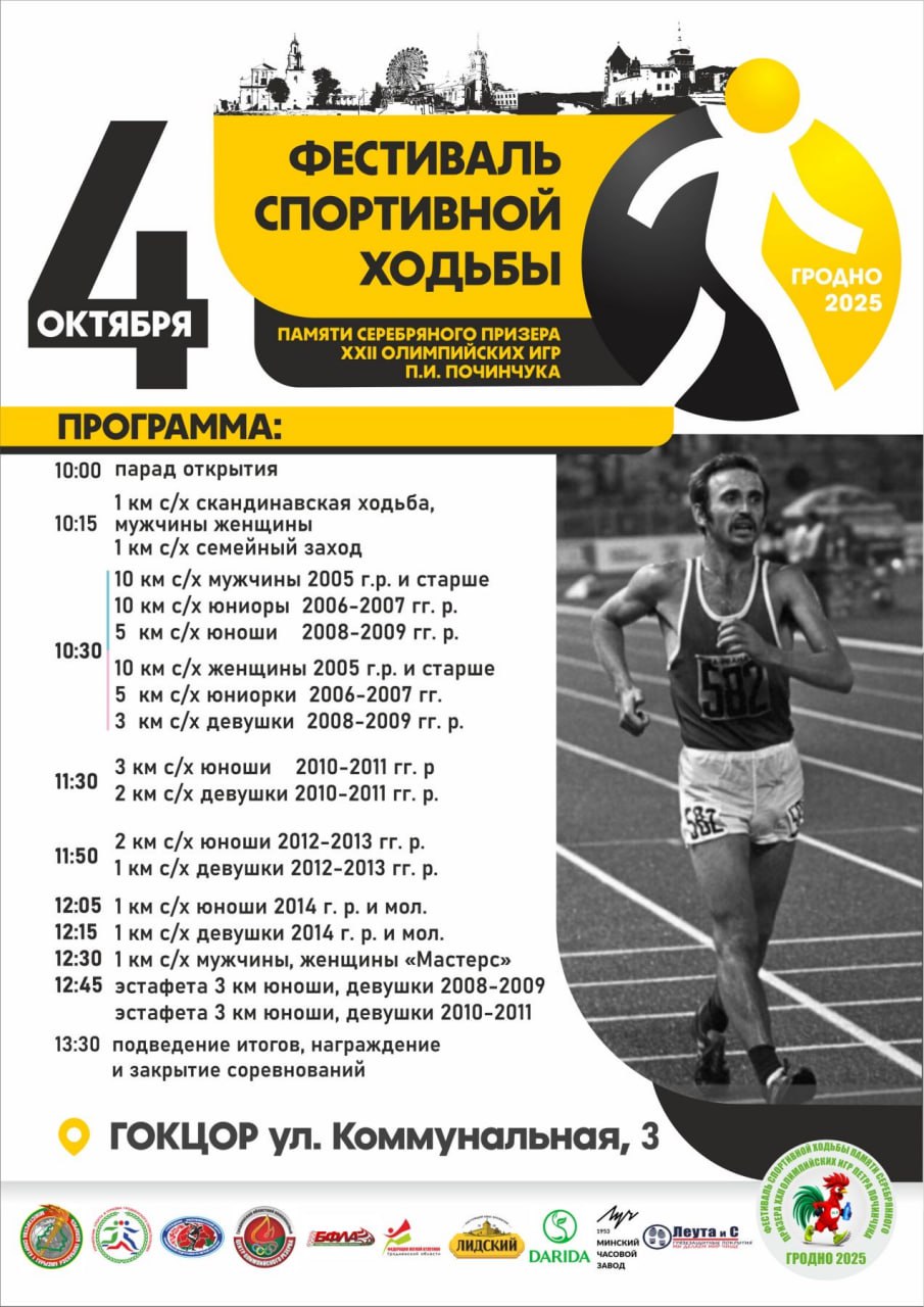 В этот же день пройдет первенство Гродненской области по спортивной ходьбе. Состязания начнутся в 10 часов. Место проведения — сертифицированная трасса на улице Коммунальной, пишет горисполком.
