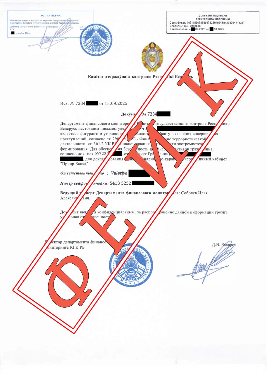 В подтверждение своих слов присылают по мессенджеру фальшивый документ якобы за подписью директора Департамента финансового мониторинга Комитета госконтроля, в котором указывается, что человек является фигурантом уголовного дела за действия, связанные с финансированием террористических формирований.