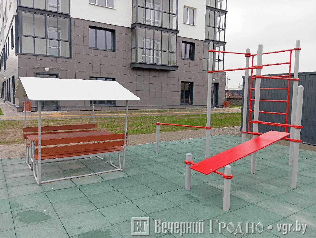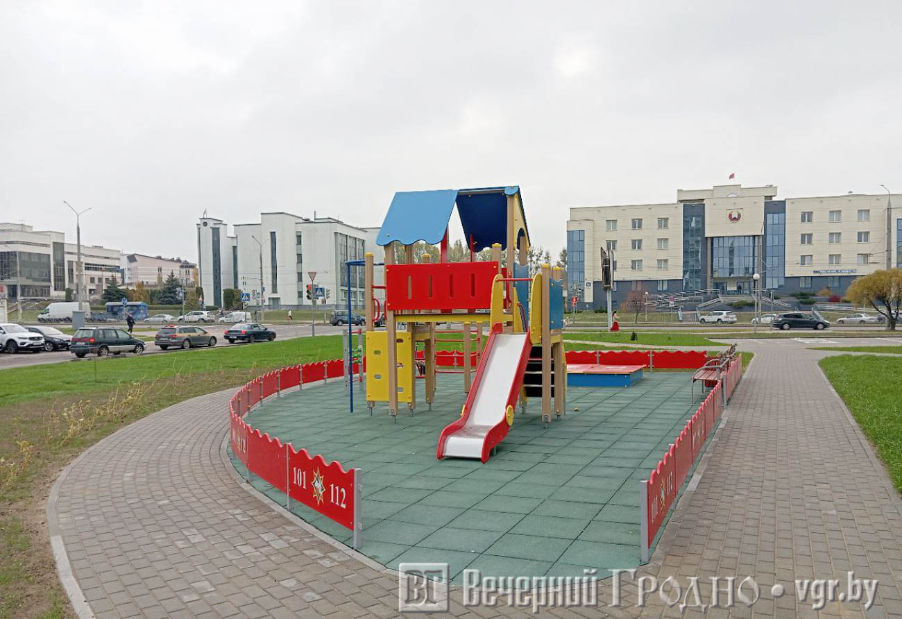 Рядом установлена детская площадка, посвященная пожарной безопасности. Тема выбрана неслучайно — рядом с жилым комплексом расположено здание Гродненского областного управления МЧС. Кроме того, организована небольшая спортивная площадка с турниками.