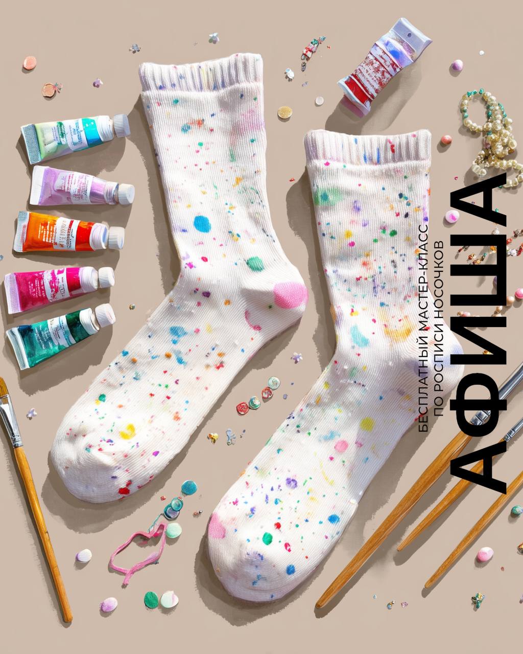 С помощью кисточек и красок будем вместе превращать обычные белые носки в произведение искусства. Модно, эксклюзивно и очень весело!
