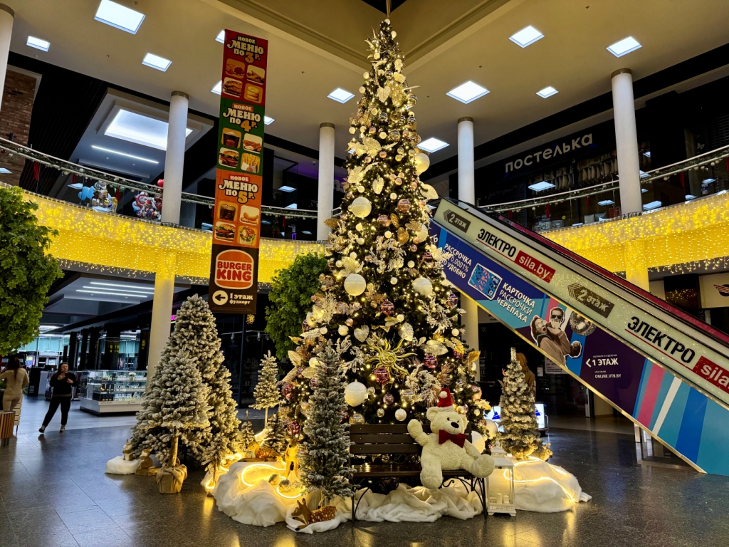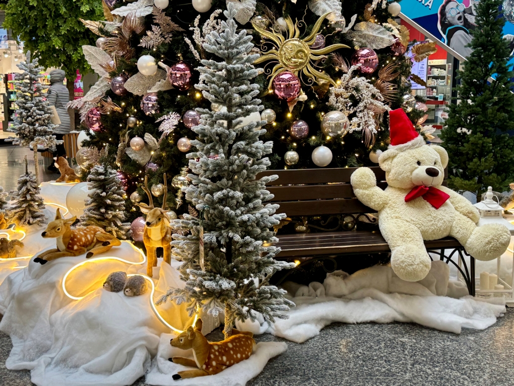 В сердце ТЦ, в атриуме, вас ждет главный символ праздника — семиметровая ель, украшенная в нежной палитре розового, серебра и золота. Ее мерцающие огни и изящные украшения создают по-настоящему праздничную атмосферу. А у основания ели расположился целый волшебный лес из елочек, где «поселились» очаровательные лесные звери — идеальное место для первых новогодних фотографий с детьми!