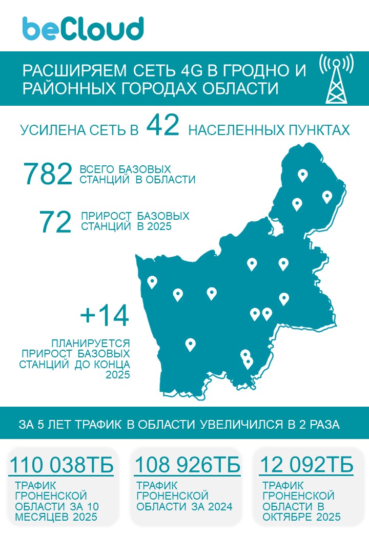 beCloud развивает инфраструктуру сети 4G в Гродно и Гродненской области, охватывая, в том числе, и отдаленные городки и деревни скоростным мобильным интернетом. С начала 2025 года покрытие расширилось в десятках населенных пунктах, в частности: