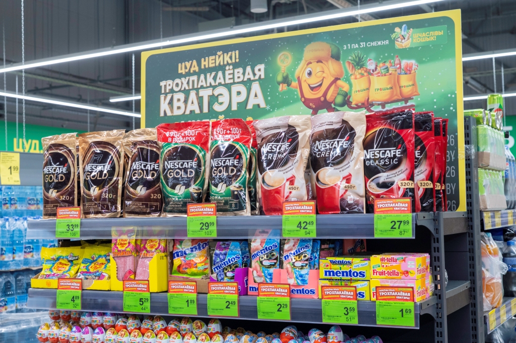 Среди игровых товаров ─ чай, кофе, сладости, средства личной гигиены, корма для домашних животных и другие популярные товары. Полный список вы найдете на сайте igra.groshyk.by и в газете «Знамя юности» от 20 ноября 2025 года. В дискаунтерах эти товары отмечены зелеными ценниками, а также надценниками с названием игры «Шчаслівы кошык!»