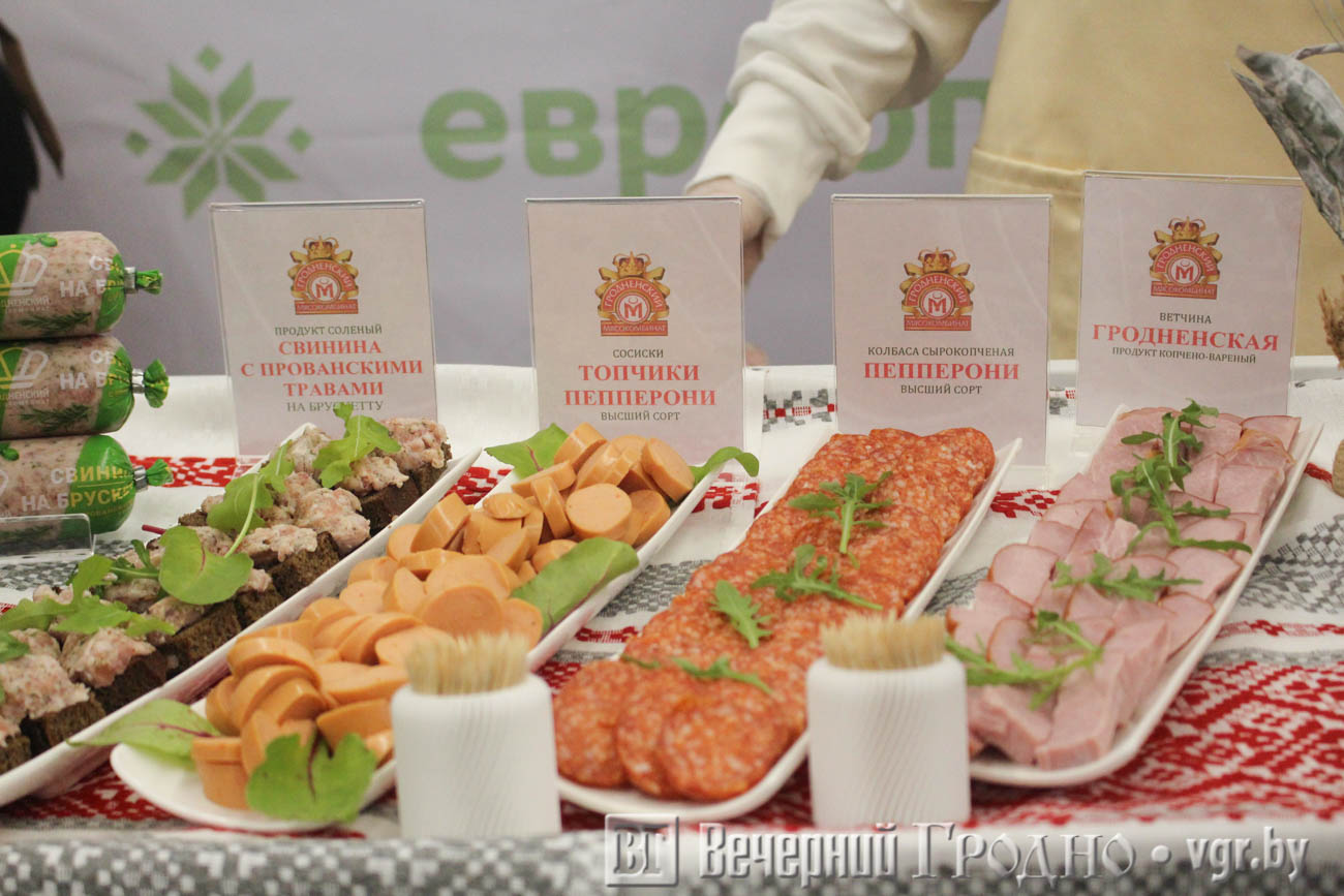 Мясокомбинат представил покупателям «Евроопта» свинину на брускетту с прованскими травами, сосиски «Топчики пепперони», колбасу сырокопченую «Пепперони», а также ветчину «Гродненскую».